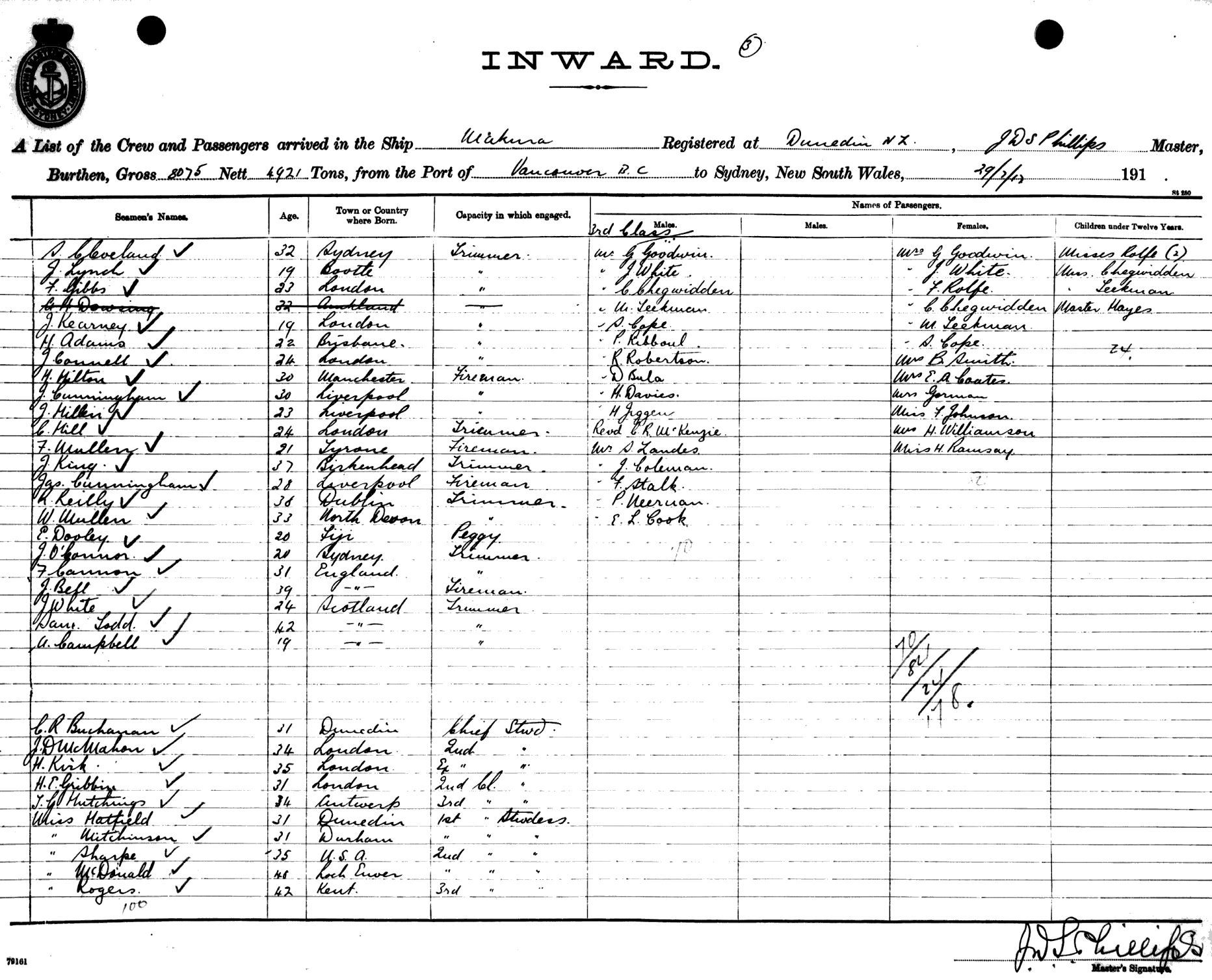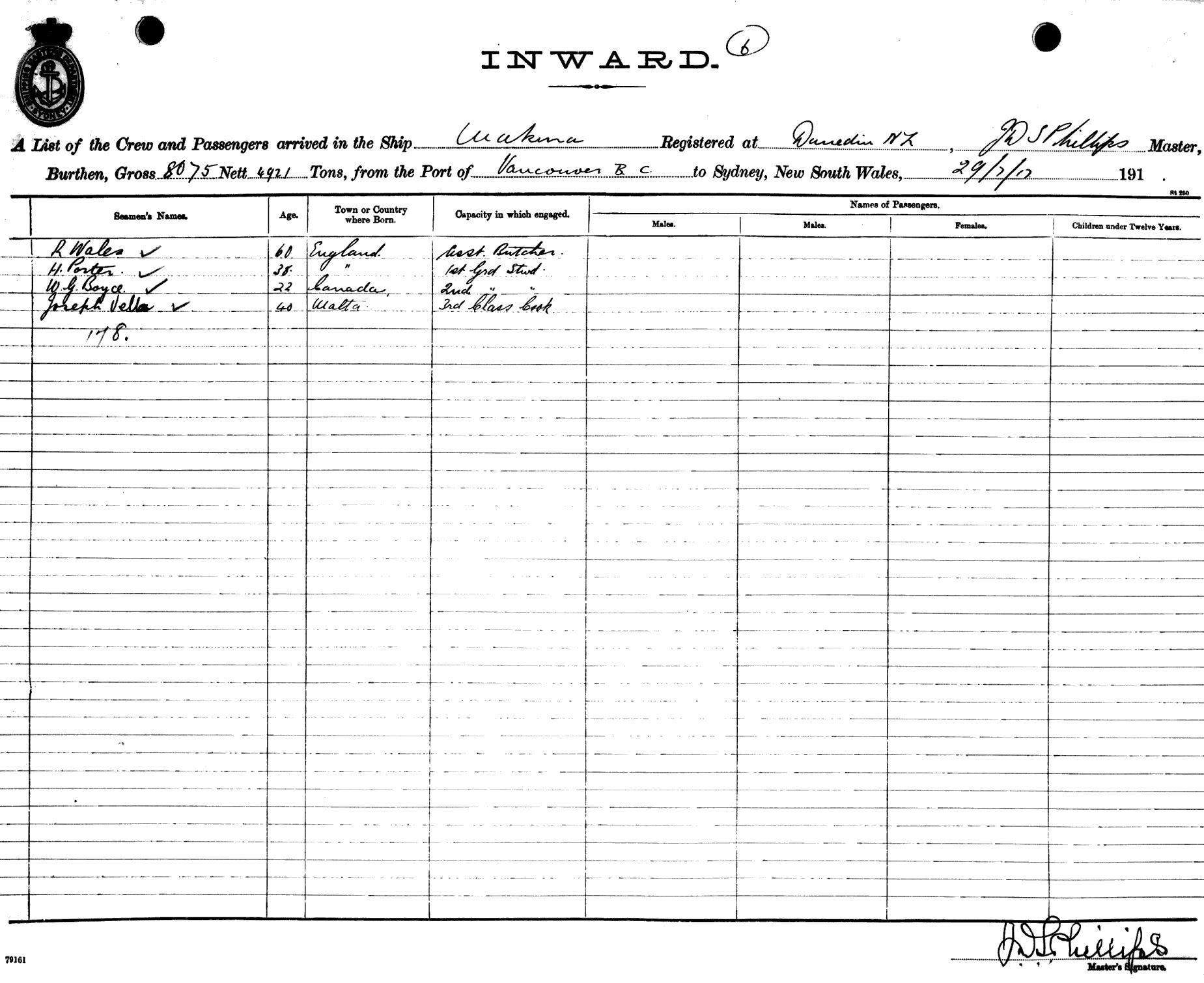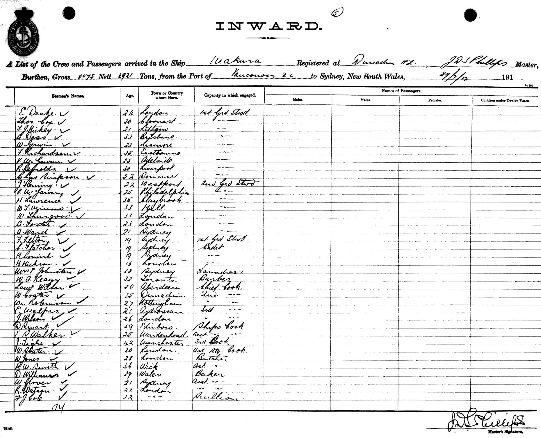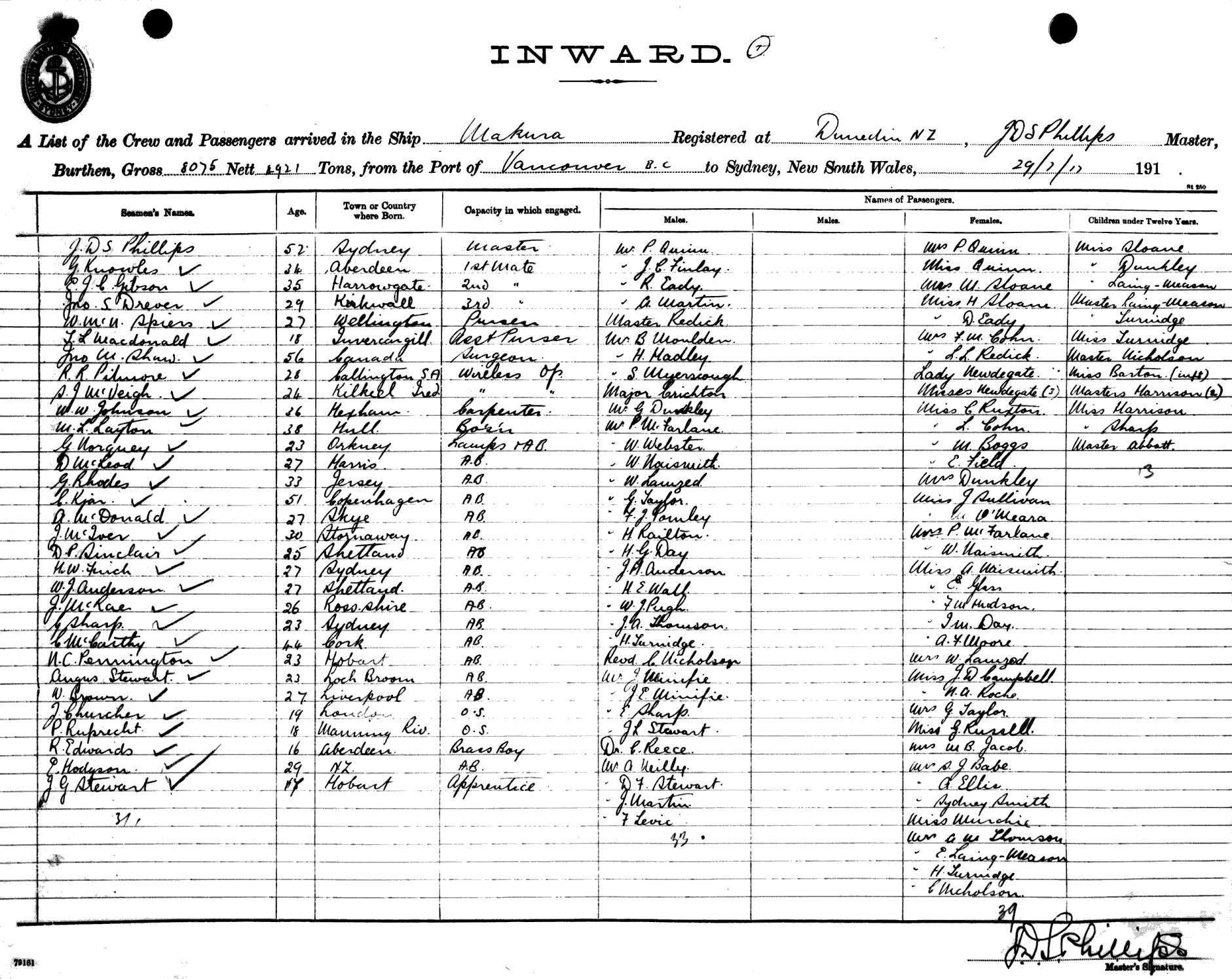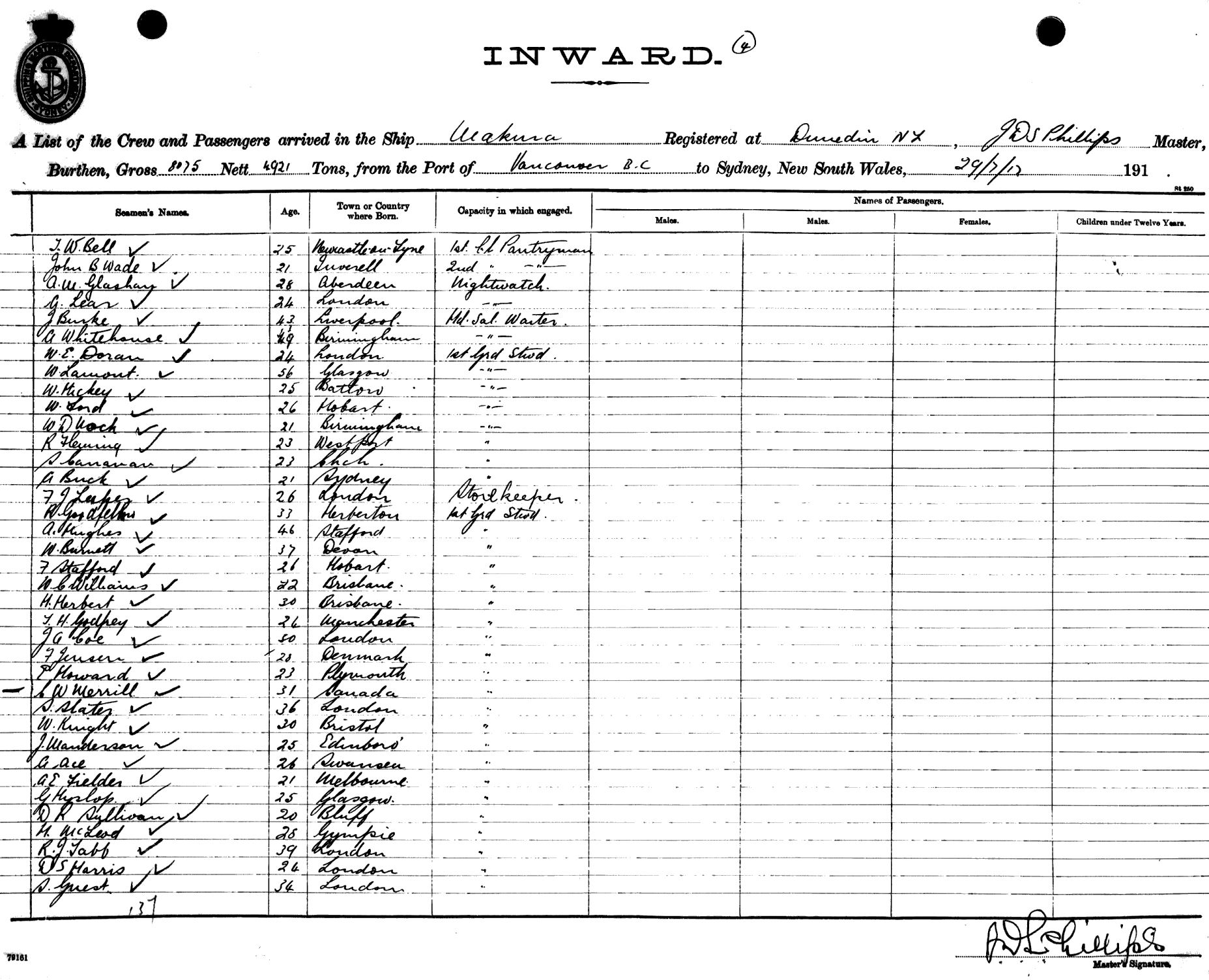 Mariners and ships in Australian Waters | MAKURAOF DUNEDIN, N.Z., J. D. S. PHILLIPS, MASTER, BURTHEN 8075/4921 TONS FROM THE PORT OF VANCOUVER, B.C. TO SYDNEY, NEW SOUTH WALES, 29TH JULY 1917 |