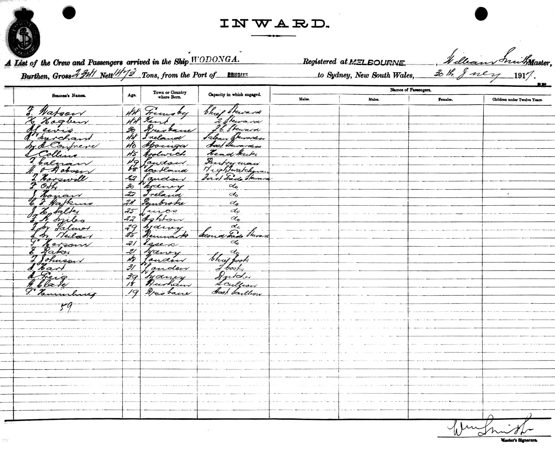 WODONGAOF MELBOURNE, WILLIAM SMITH, MASTER, BURTHEN 2341/1473 TONS FROM THE PORTS OF BRISBANE & CAIRNS TO SYDNEY, NEW SOUTH WALES, 30TH JULY 1917 |