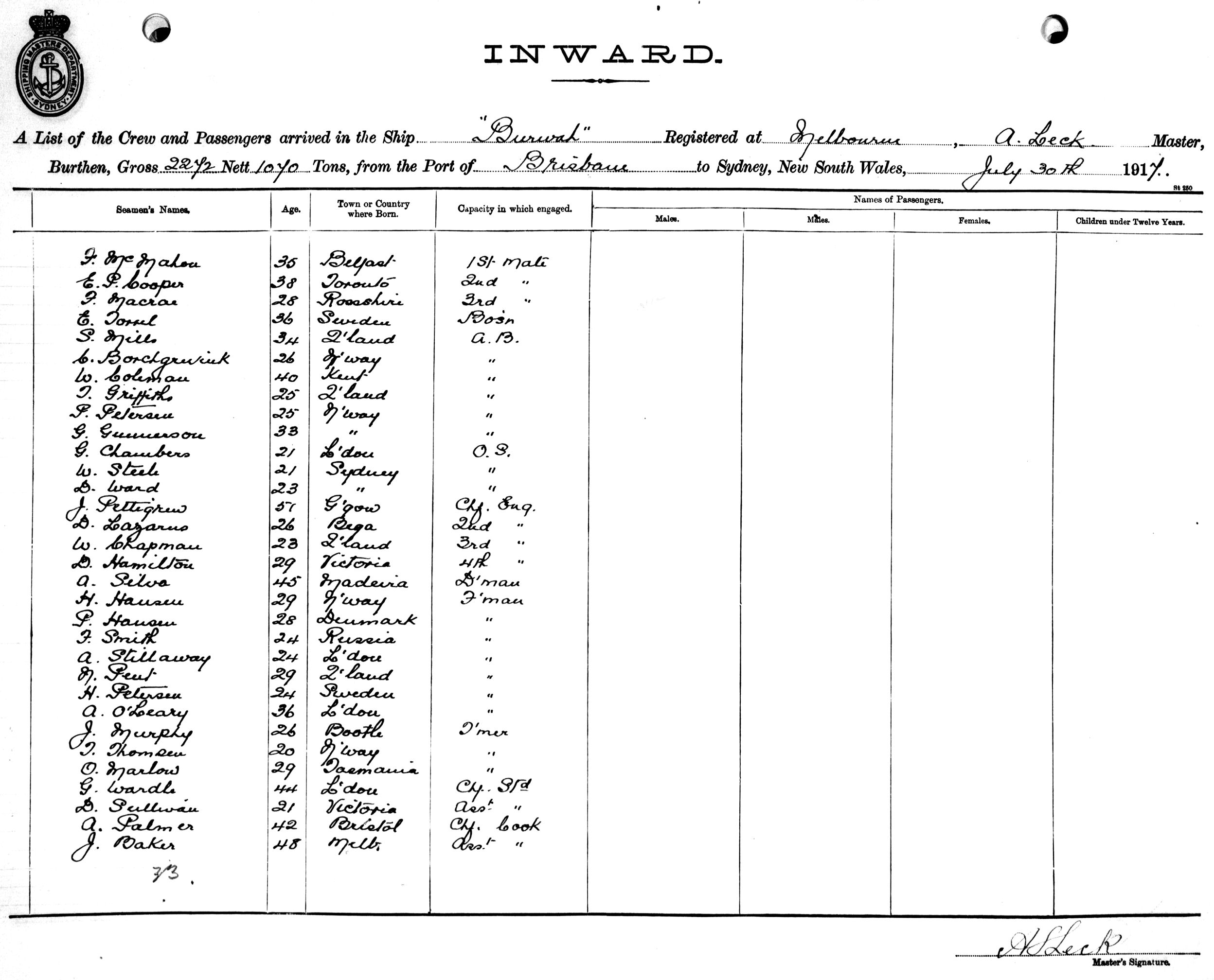 BURWAHOF MELBOURNE, A. LECK, MASTER, BURTHEN 2272/1070 TONS FROM THE PORT OF BRISBANE TO SYDNEY, NEW SOUTH WALES, 30TH JULY 1917 |