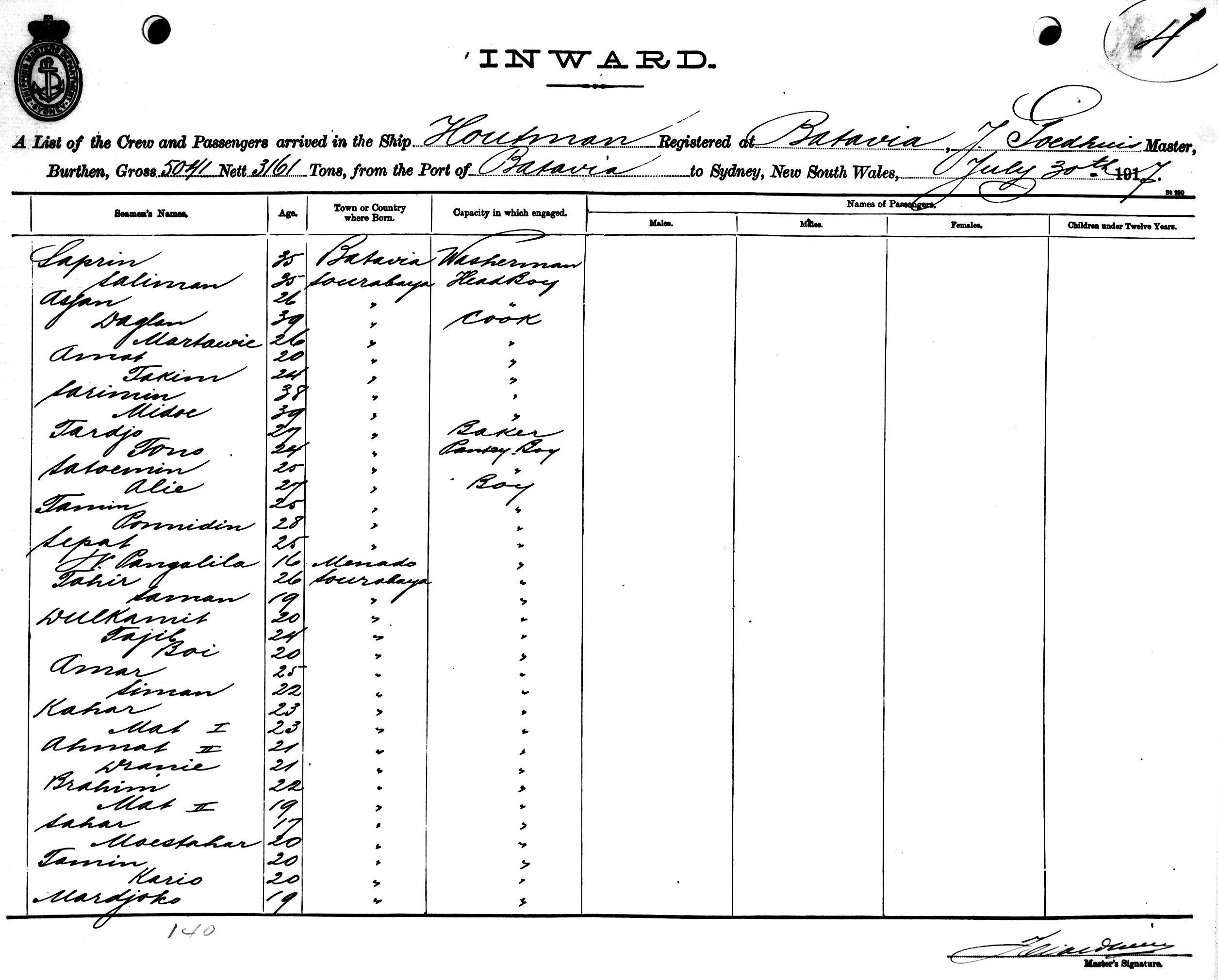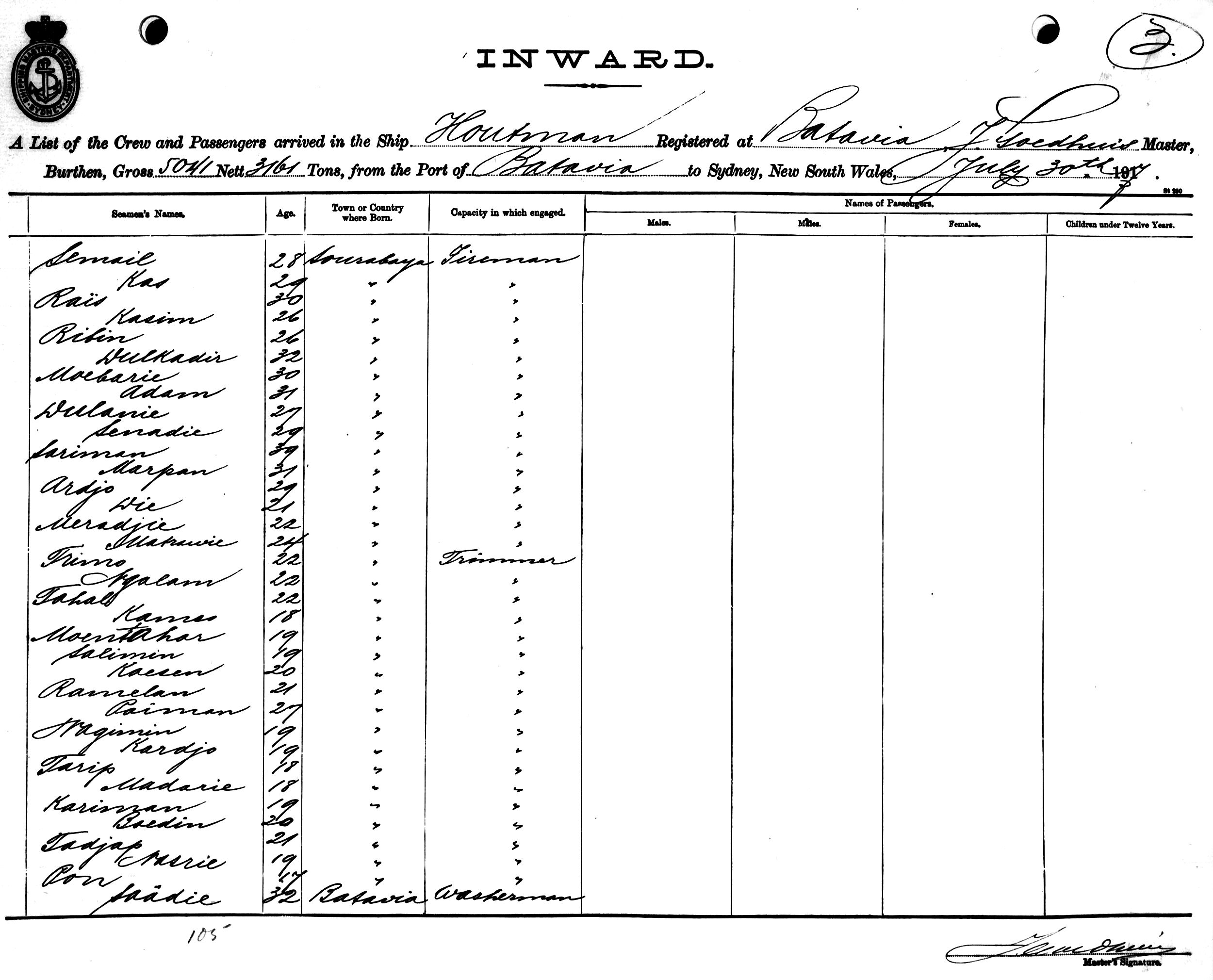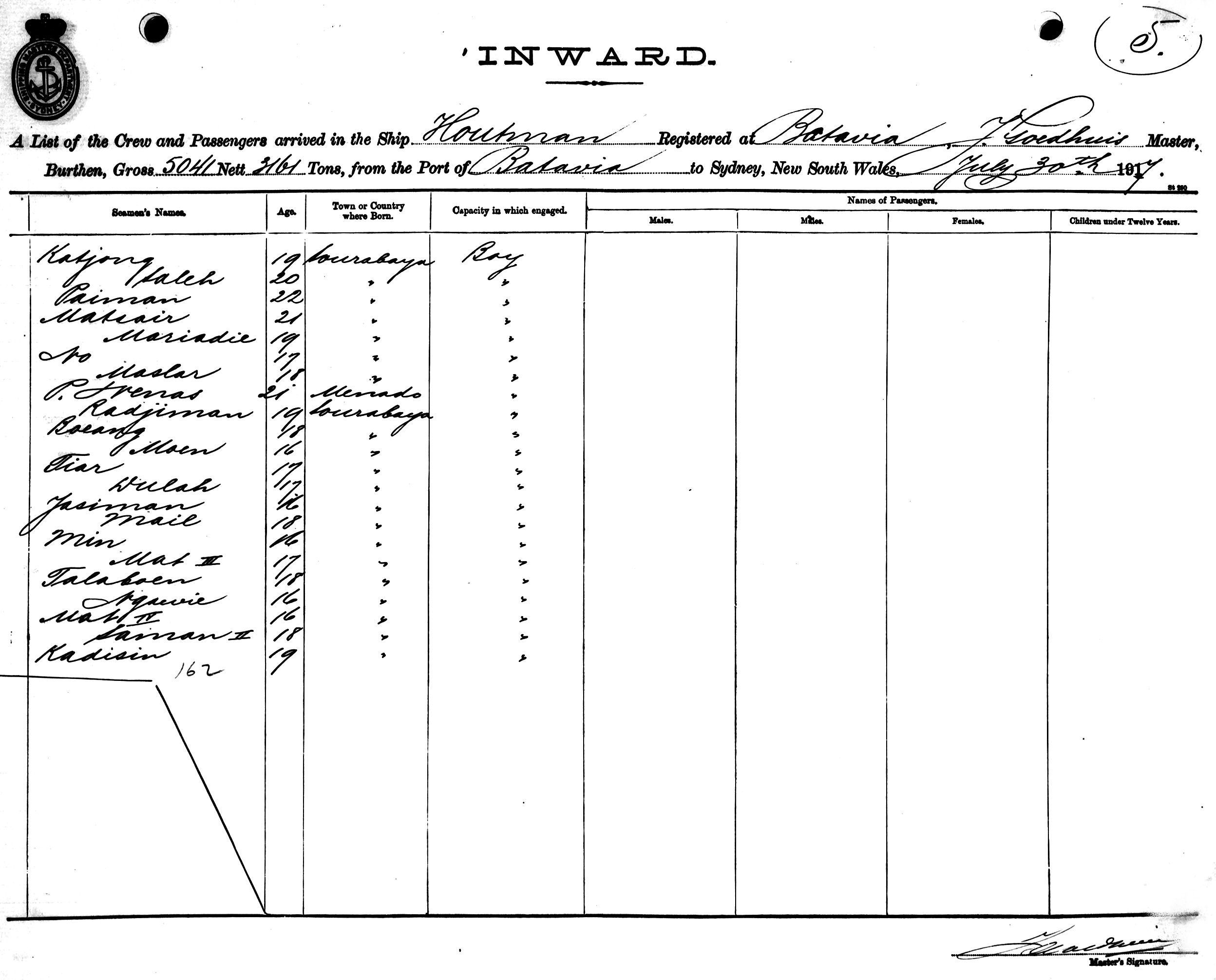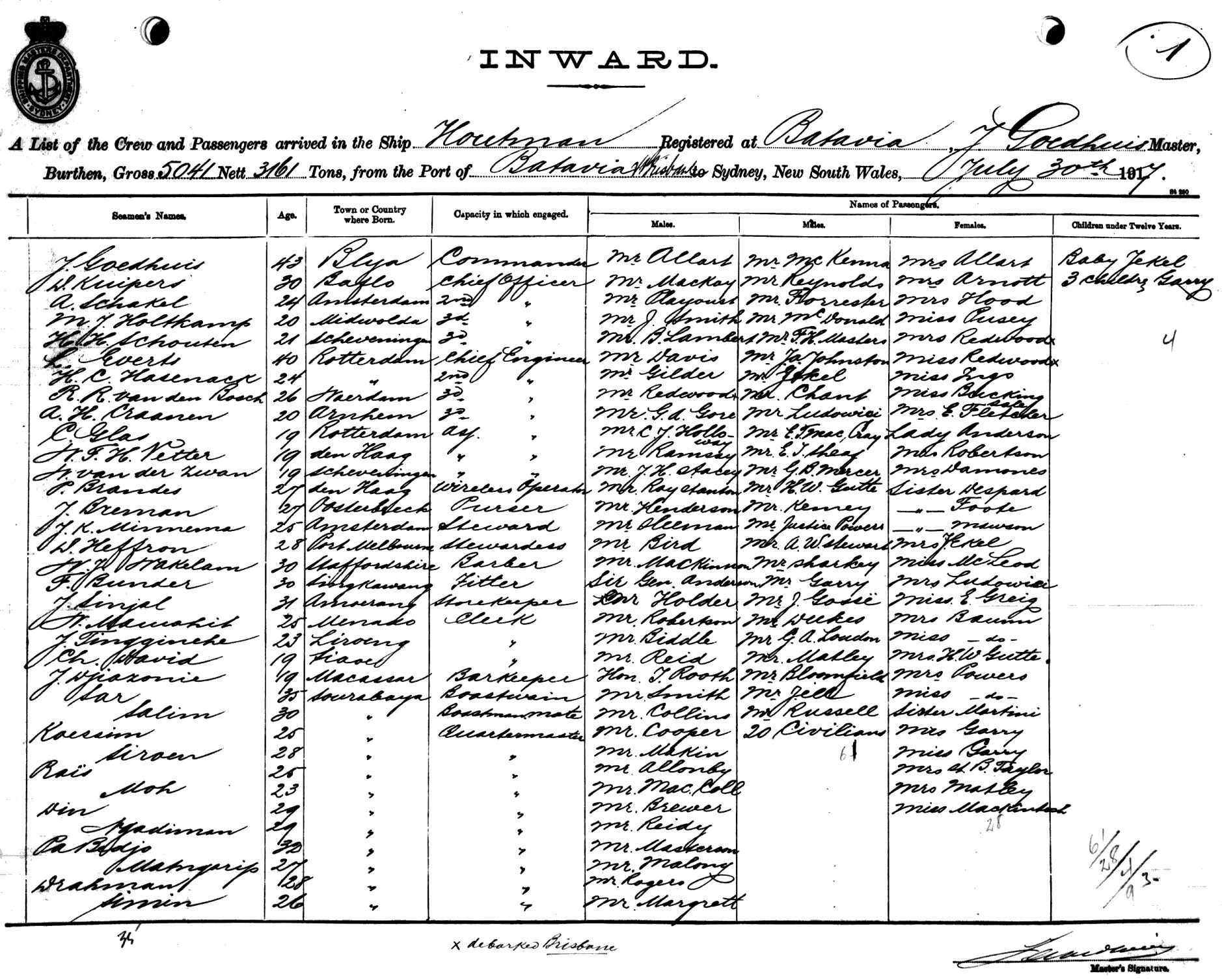 HOUTMANOF BATAVIA, J. GOEDHUIS, MASTER, BURTHEN 5041/3161 TONS FROM THE PORT OF BATAVIA VIA BRISBANE TO SYDNEY, NEW SOUTH WALES, 30TH JULY 1917 |