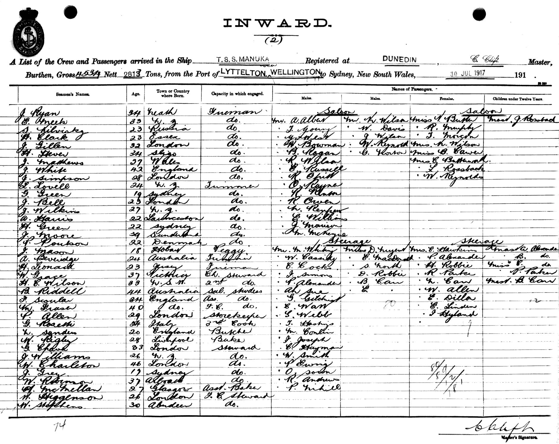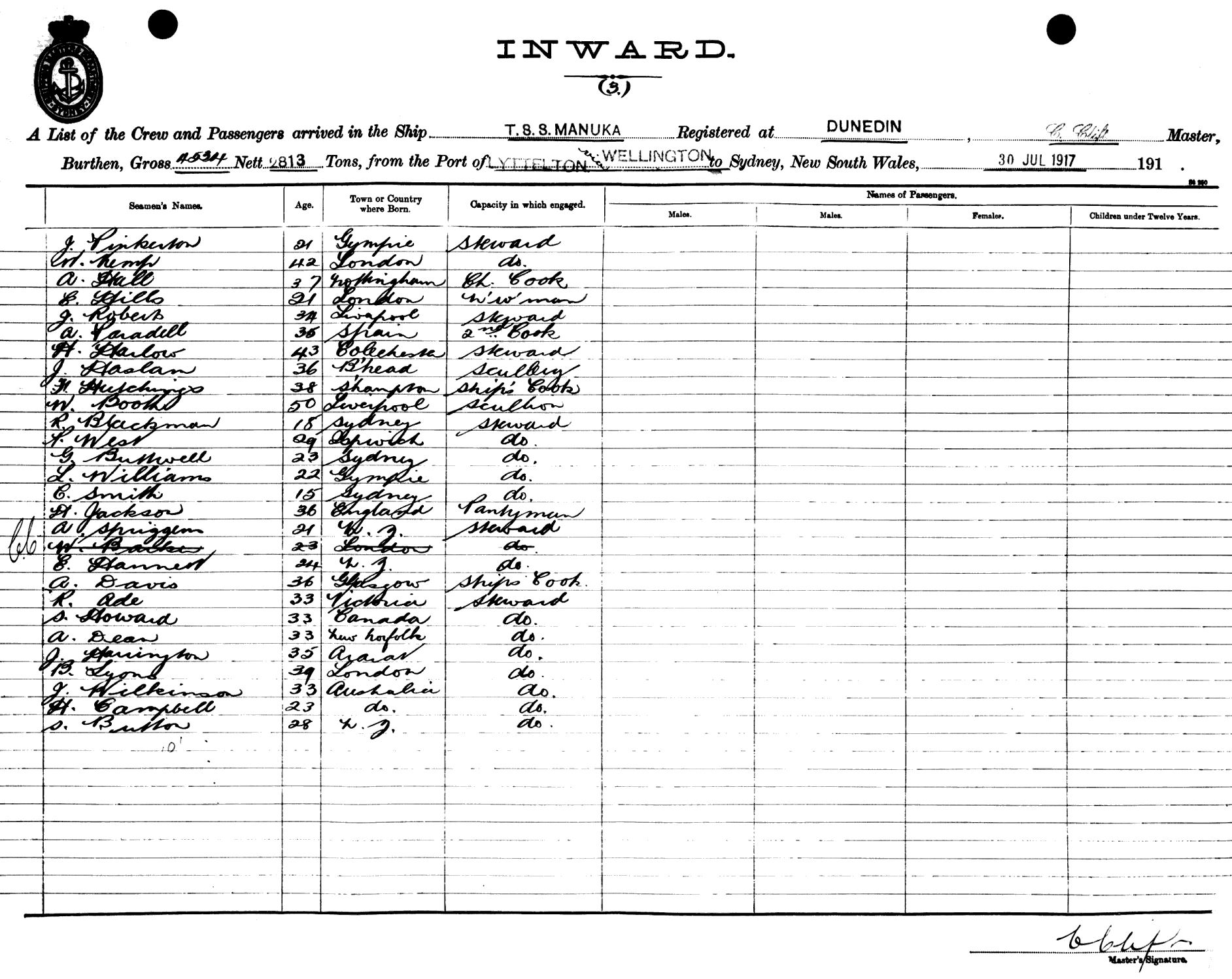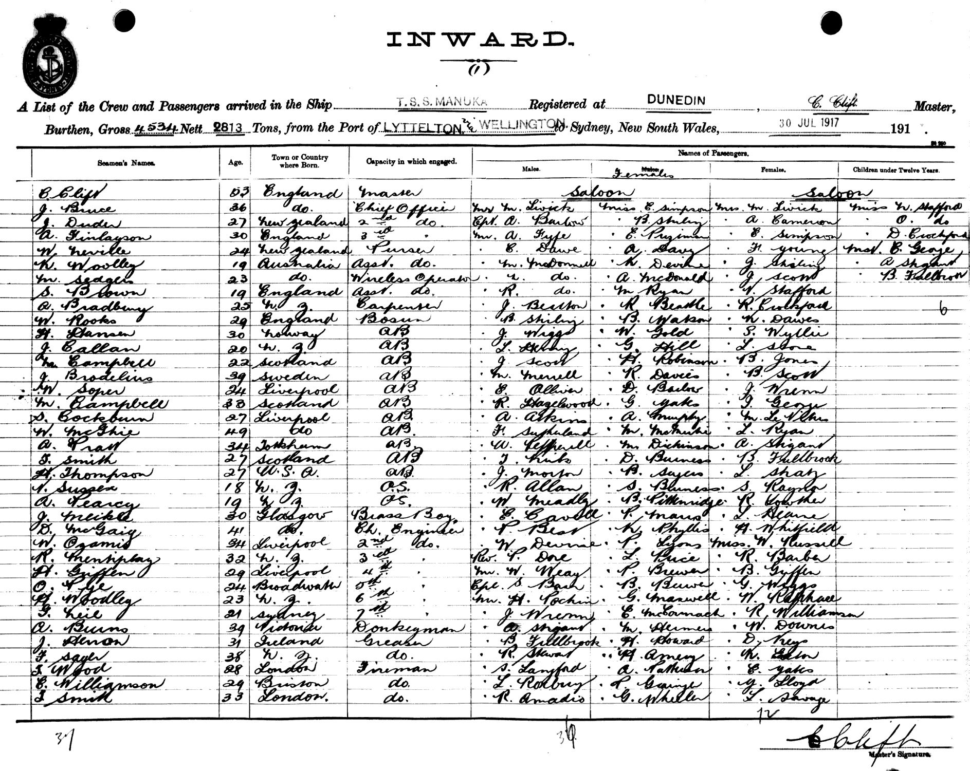 MANUKAOF DUNEDIN, C. CLIFT, MASTER, BURTHEN 4534/2813 TONS FROM THE PORT OF LYTTELTON via WELLINGTON TO SYDNEY, NEW SOUTH WALES, 30TH JULY 1917 |