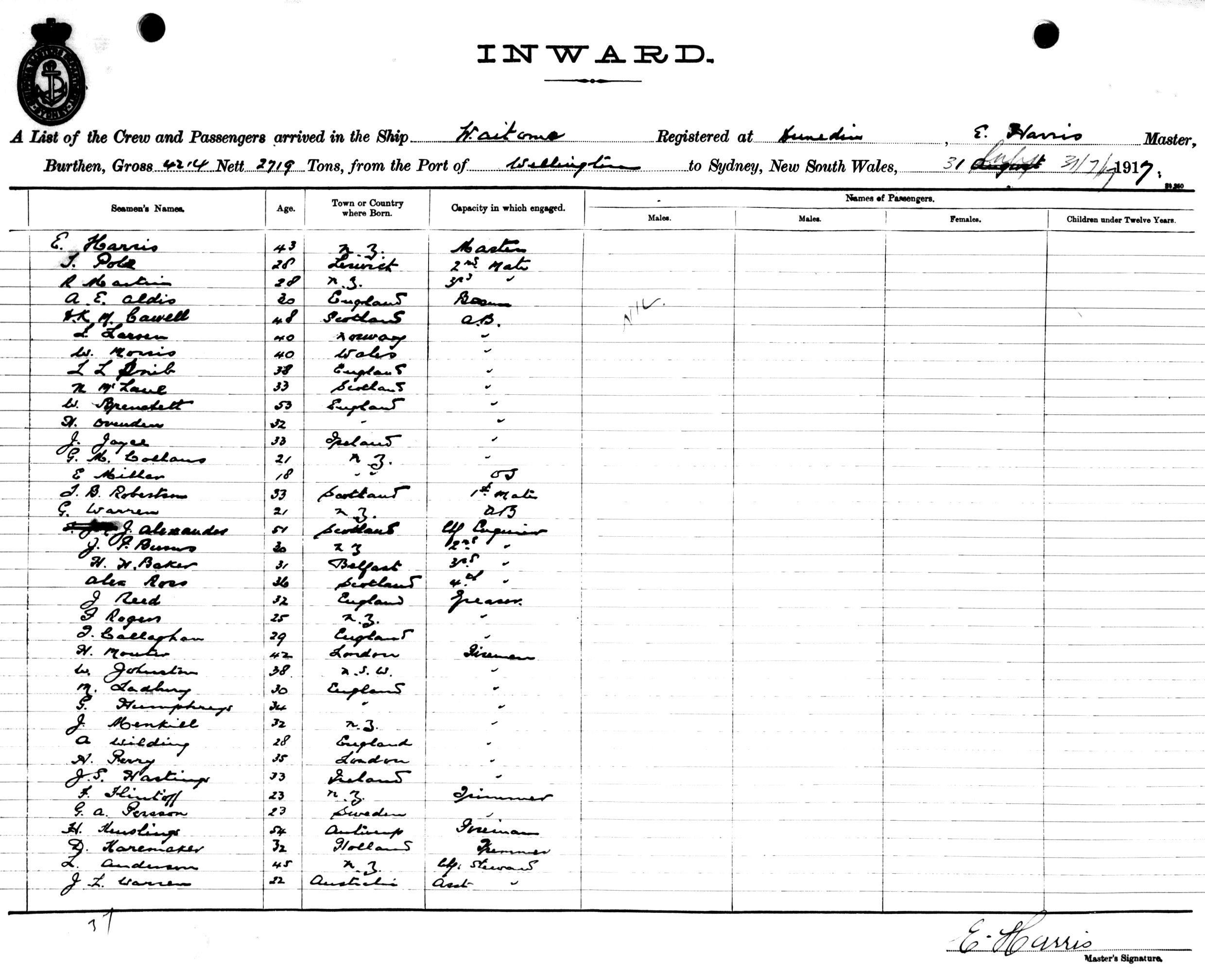 WAITOMOOF DUNEDIN, E. HARRIS, MASTER, BURTHEN 4214/2719 TONS FROM THE PORT OF WELLINGTON TO SYDNEY, NEW SOUTH WALES, 31ST JULY 1917 |
