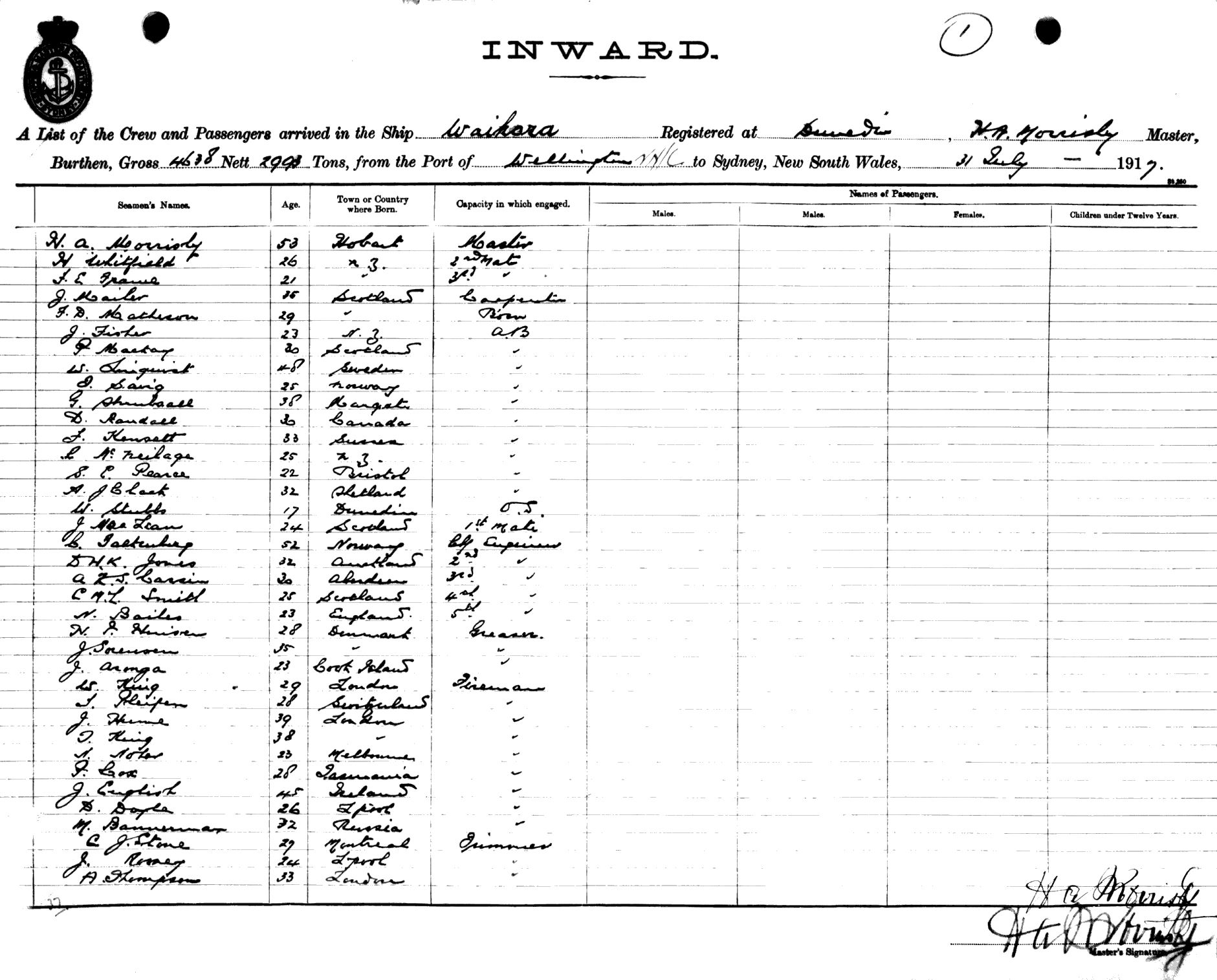 WAIHORAOF DUNEDIN, H. A. MORRISBY, MASTER, BURTHEN 4638/2993 TONS FROM THE PORT OF WELLINGTON via NEWCASTLE TO SYDNEY, NEW SOUTH WALES, 31ST JULY 1917 |