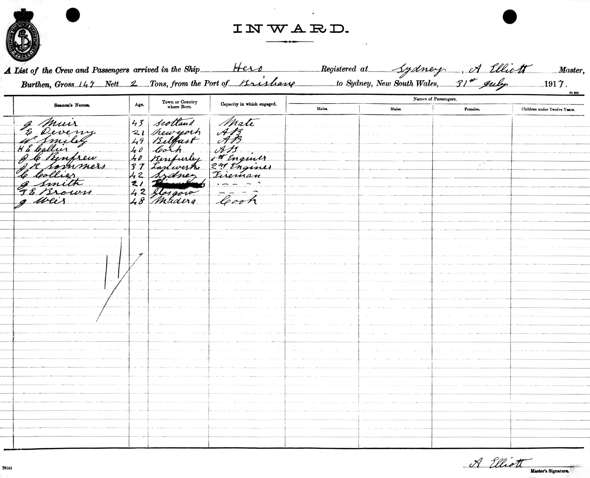 HEROOF SYDNEY, A. ELLIOTT, MASTER, BURTHEN 147/2 TONS FROM THE PORT OF BRISBANE TO SYDNEY, NEW SOUTH WALES, 31ST JULY 1917 |
