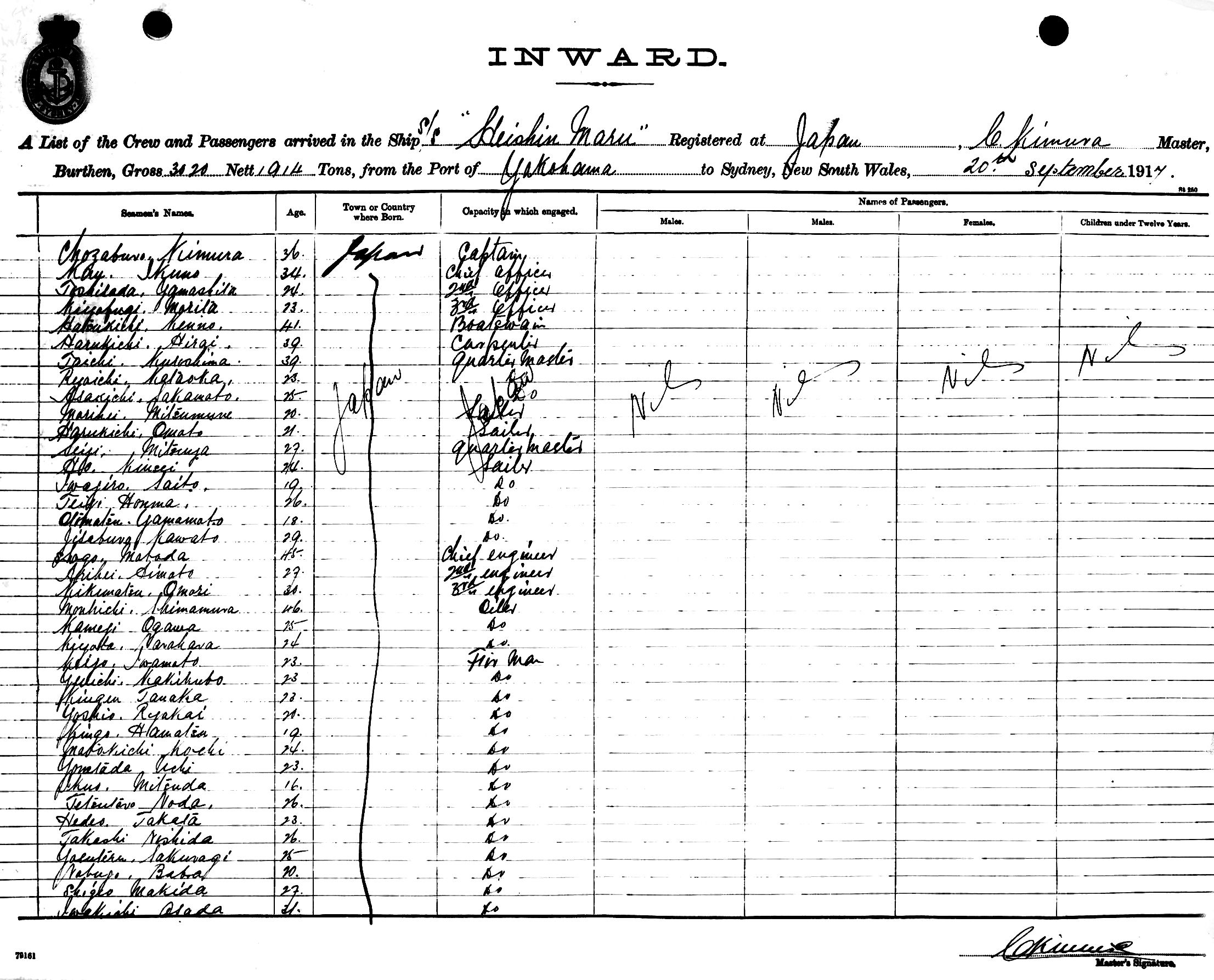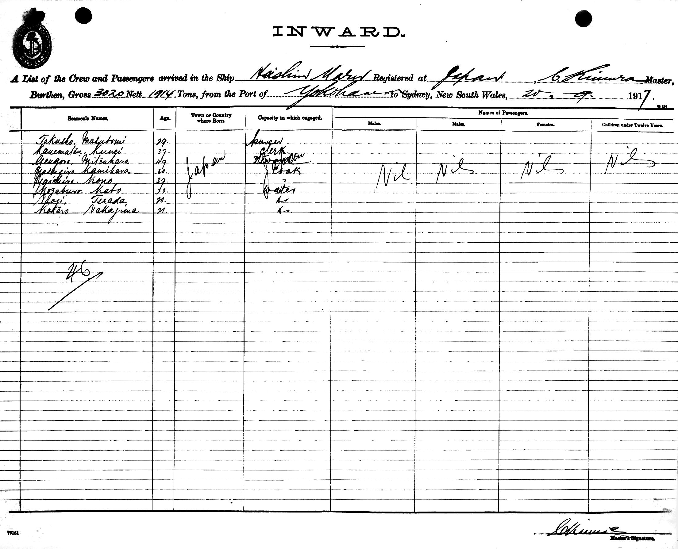 HEISHIN MARUOF JAPAN, C. KIMURA, MASTER, BURTHEN 3120/1914 TONS FROM THE PORT OF YOKOHAMA TO SYDNEY, NEW SOUTH WALES, 20TH SEPTEMBER 1917 |