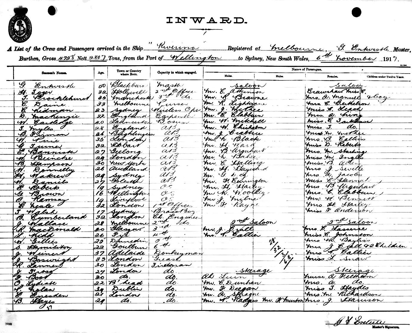 RIVERINAOF MELBOURNE, G. F. ENTWISLE, MASTER, BURTHEN 4758/2807 TONS FROM THE PORT OF WELLINGTON TO SYDNEY, NEW SOUTH WALES, 6TH NOVEMBER 1917 |