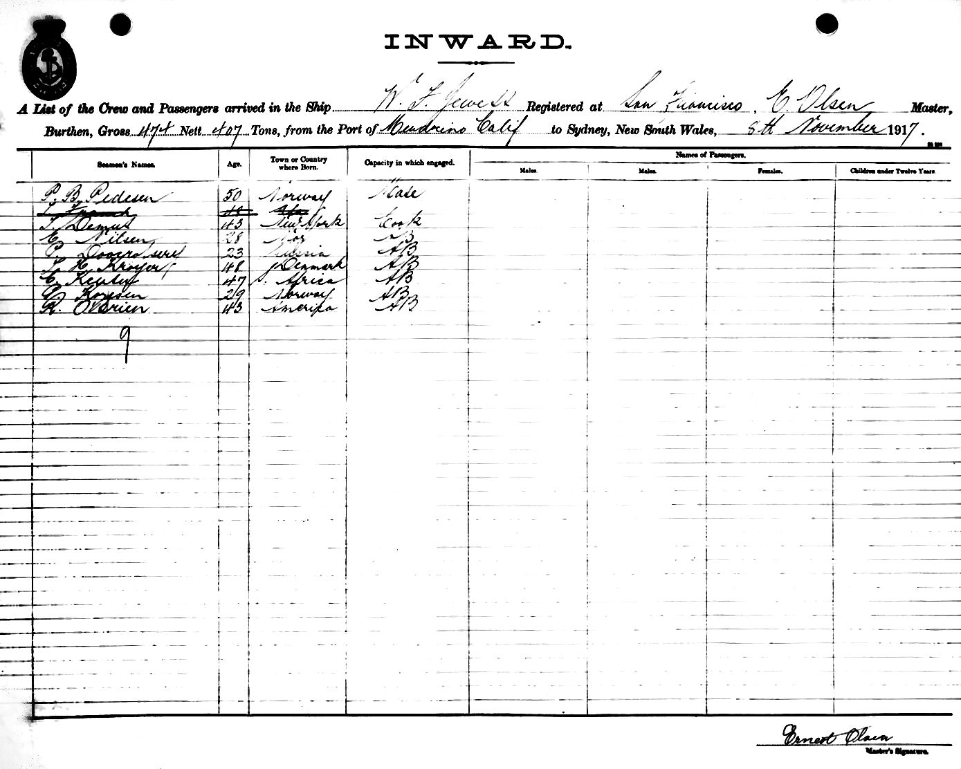 W F JEWETTOF SAN FRANCISCO, E. OLSEN, MASTER, BURTHEN 474/407 TONS FROM THE PORT OF MENDOCINO, CALIFORNIA TO SYDNEY, NEW SOUTH WALES, 8TH NOVEMBER 1917 |