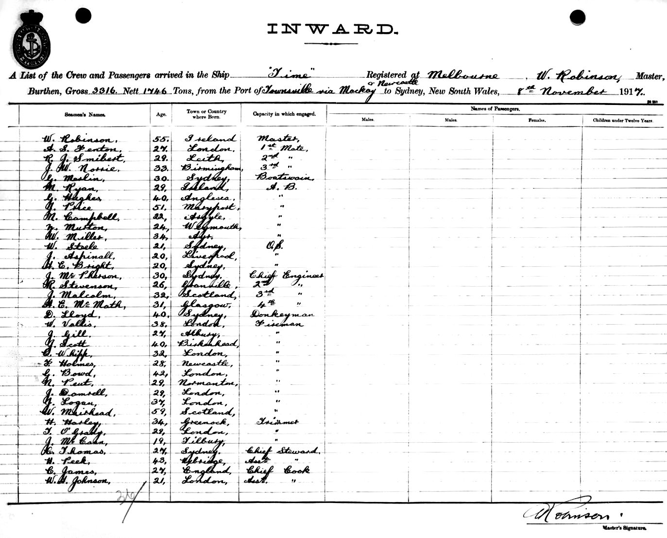 TIMEOF MELBOURNE, W. ROBINSON, MASTER, BURTHEN 3316/1746 TONS FROM THE PORT OF TOWNSVILLE via MACKAY & NEWCASTLE TO SYDNEY, NEW SOUTH WALES, 8TH NOVEMBER 1917 |