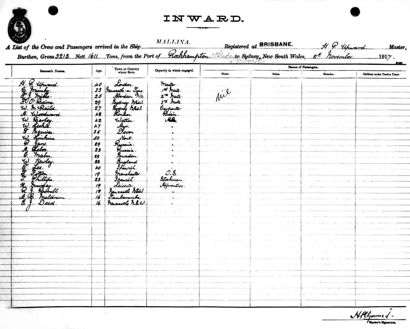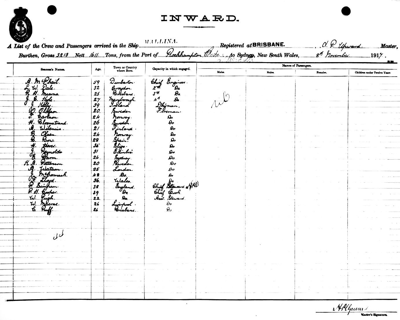 Mariners and ships in Australian Waters | MALLINAOF BRISBANE, H. P. UPWARD, MASTER, BURTHEN 3213/1611 TONS FROM THE PORT OF ROCKHAMPTON & BRISBANE via NEWCASTLE TO SYDNEY, NEW SOUTH WALES, 8TH NOVEMBER 1917 |