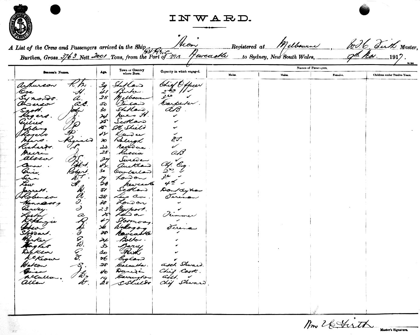 AEONOF MELBOURNE, W. T. C. FIRTH, MASTER, BURTHEN 3763/2001 TONS FROM THE PORT OF PORT PIRIE via NEWCASTLE TO SYDNEY, NEW SOUTH WALES, 9TH NOVEMBER 1917 |