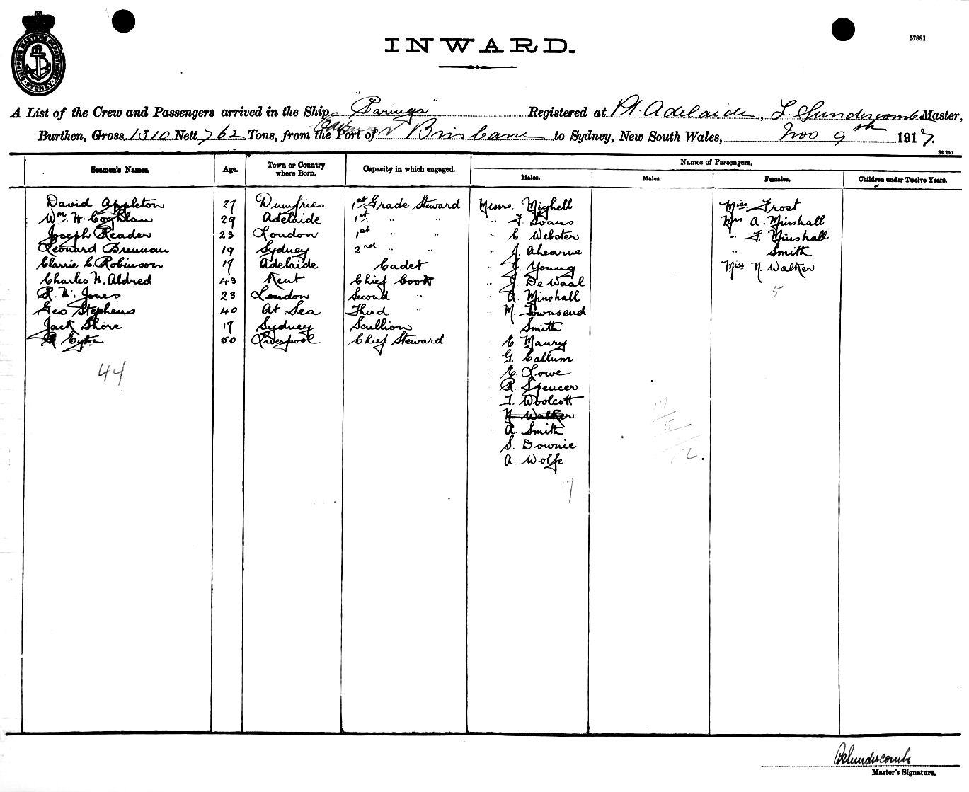 PARINGAOF PORT ADELAIDE, L. SUNDERCOMBE, MASTER, BURTHEN 1310/762 TONS FROM THE PORT OF CAIRNS via BRISBANE TO SYDNEY, NEW SOUTH WALES, 9TH NOVEMBER 1917 |