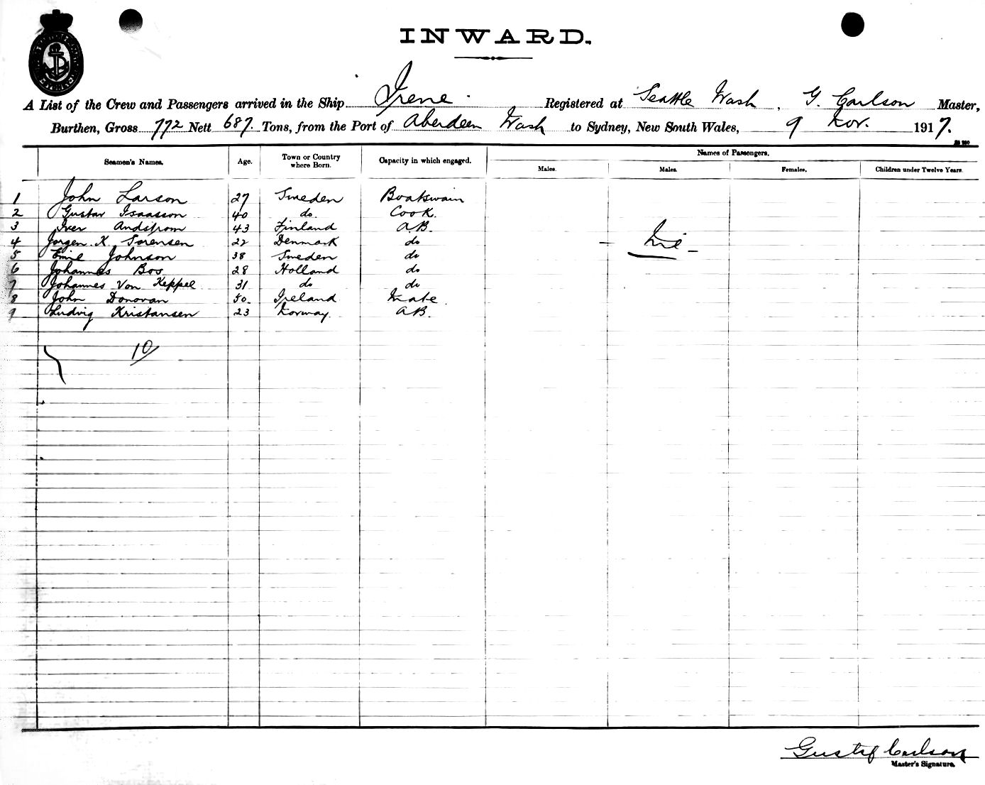 IRENEOF SEATTLE, G. CARLSON, MASTER, BURTHEN 772/687 TONS FROM THE PORT OF ABERDEEN, WASHINGTON STATE TO SYDNEY, NEW SOUTH WALES, 9TH NOVEMBER 1917 |