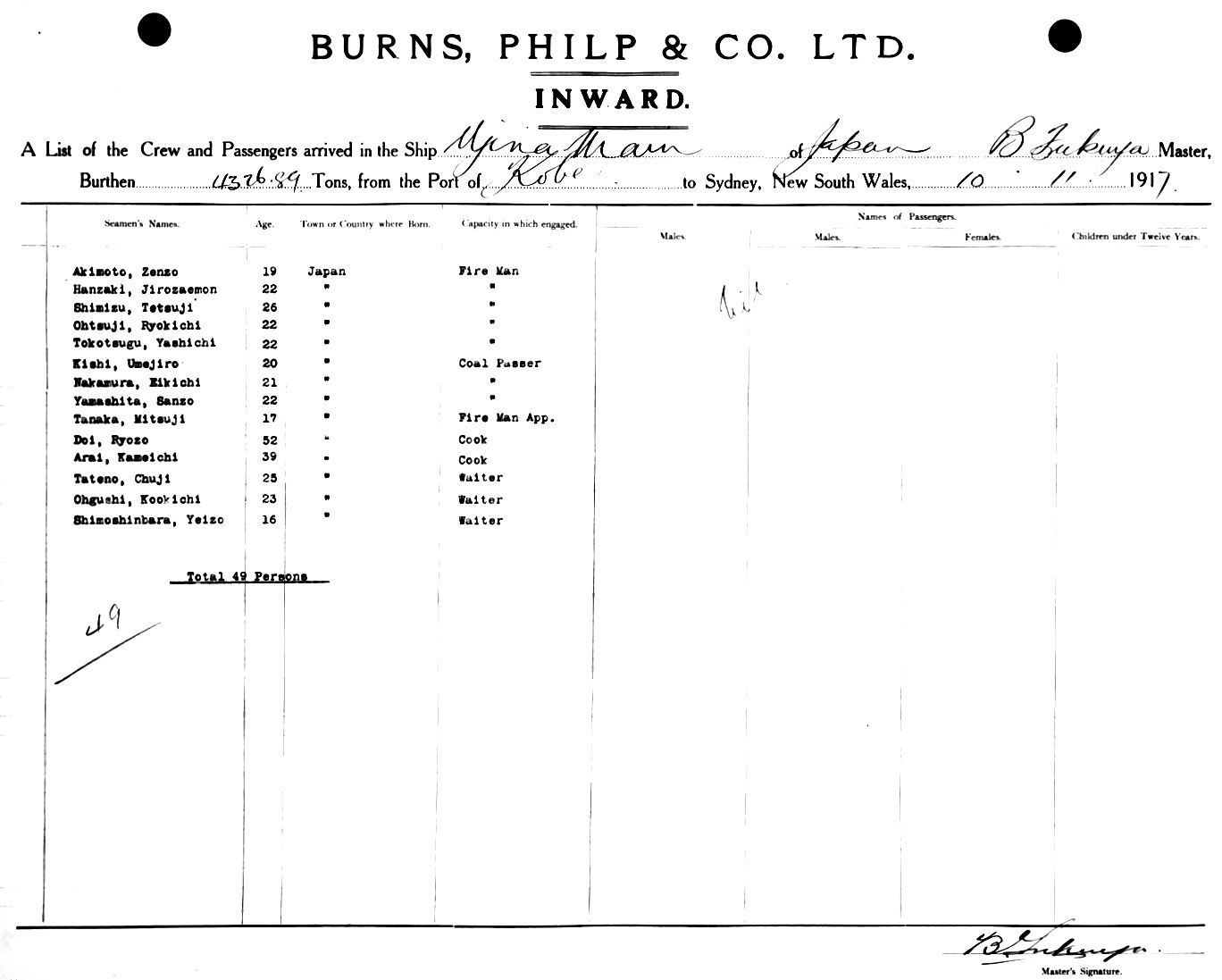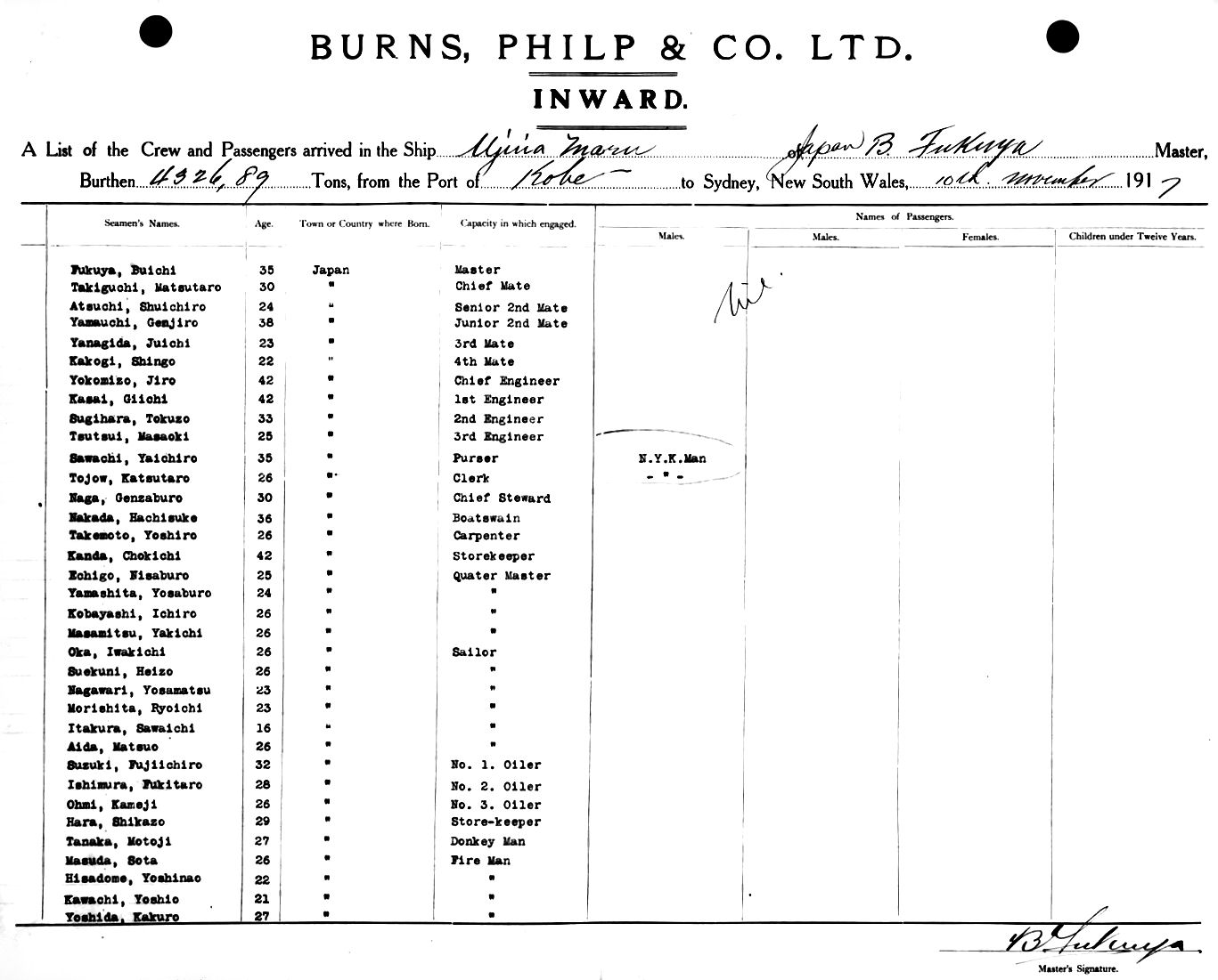 UJINA MARUOF JAPAN, B. FUKUYA, MASTER, BURTHEN 4326.89 TONS FROM THE PORT OF KOBE TO SYDNEY, NEW SOUTH WALES, 10TH NOVEMBER 1917 |