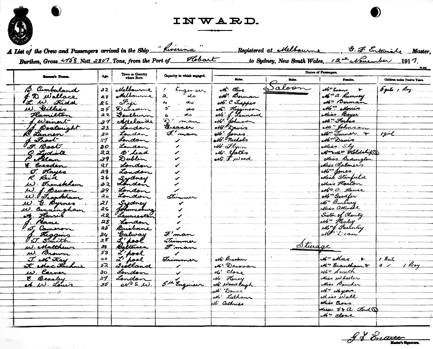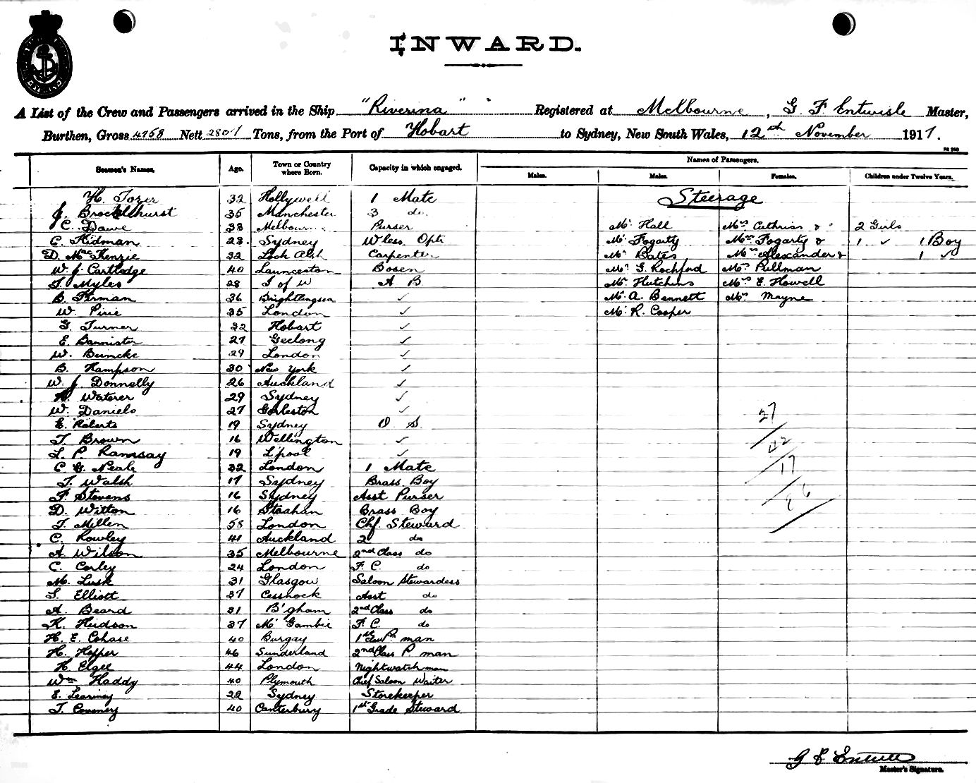 RIVERINAOF MELBOURNE, G. F. ENTWISLE, MASTER, BURTHEN 4758/2807 TONS FROM THE PORT OF HOBART TO SYDNEY, NEW SOUTH WALES, 12TH NOVEMBER 1917 |
