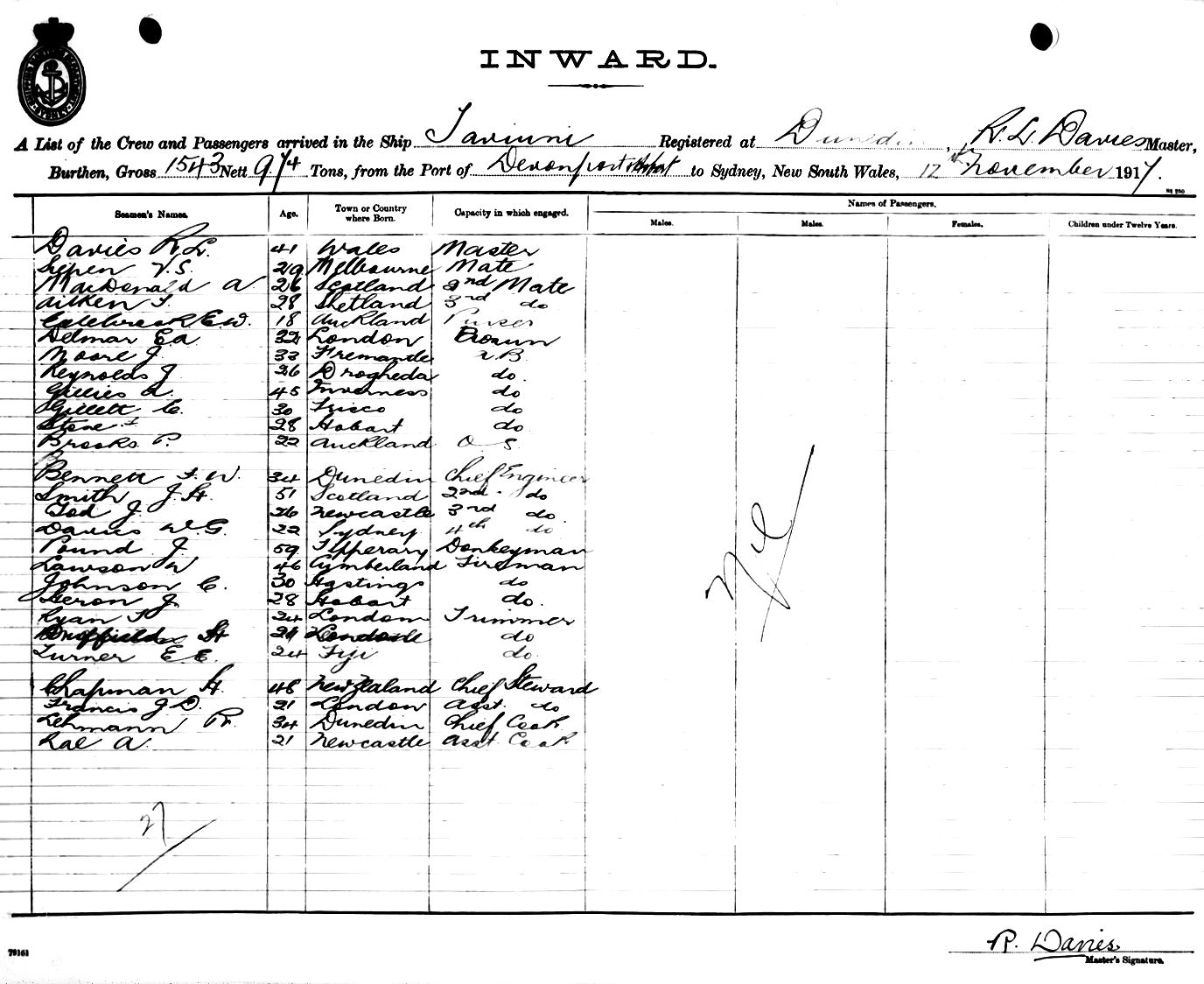 TAVIUNIOF DUNEDIN, R. L. DAVIES, MASTER, BURTHEN 1543/974 TONS FROM THE PORTS OF DEVONPORT & HOBART TO SYDNEY, NEW SOUTH WALES, 12TH NOVEMBER 1917 |