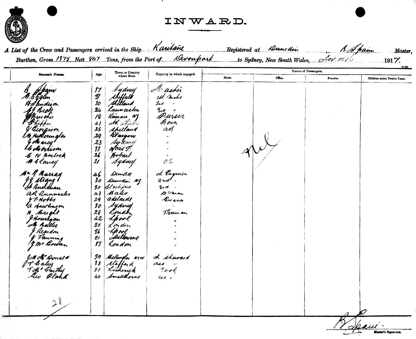 Mariners and ships in Australian Waters | KARITANEOF DUNEDIN, B. SPAIN, MASTER, BURTHEN 1375/847 TONS FROM THE PORT OF DEVONPORT TO SYDNEY, NEW SOUTH WALES, 12TH NOVEMBER 1917 |