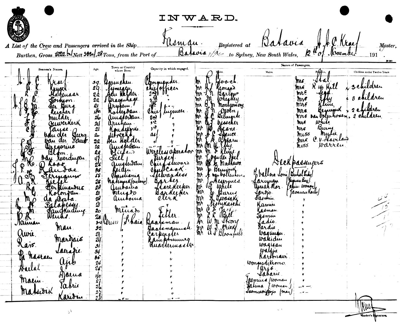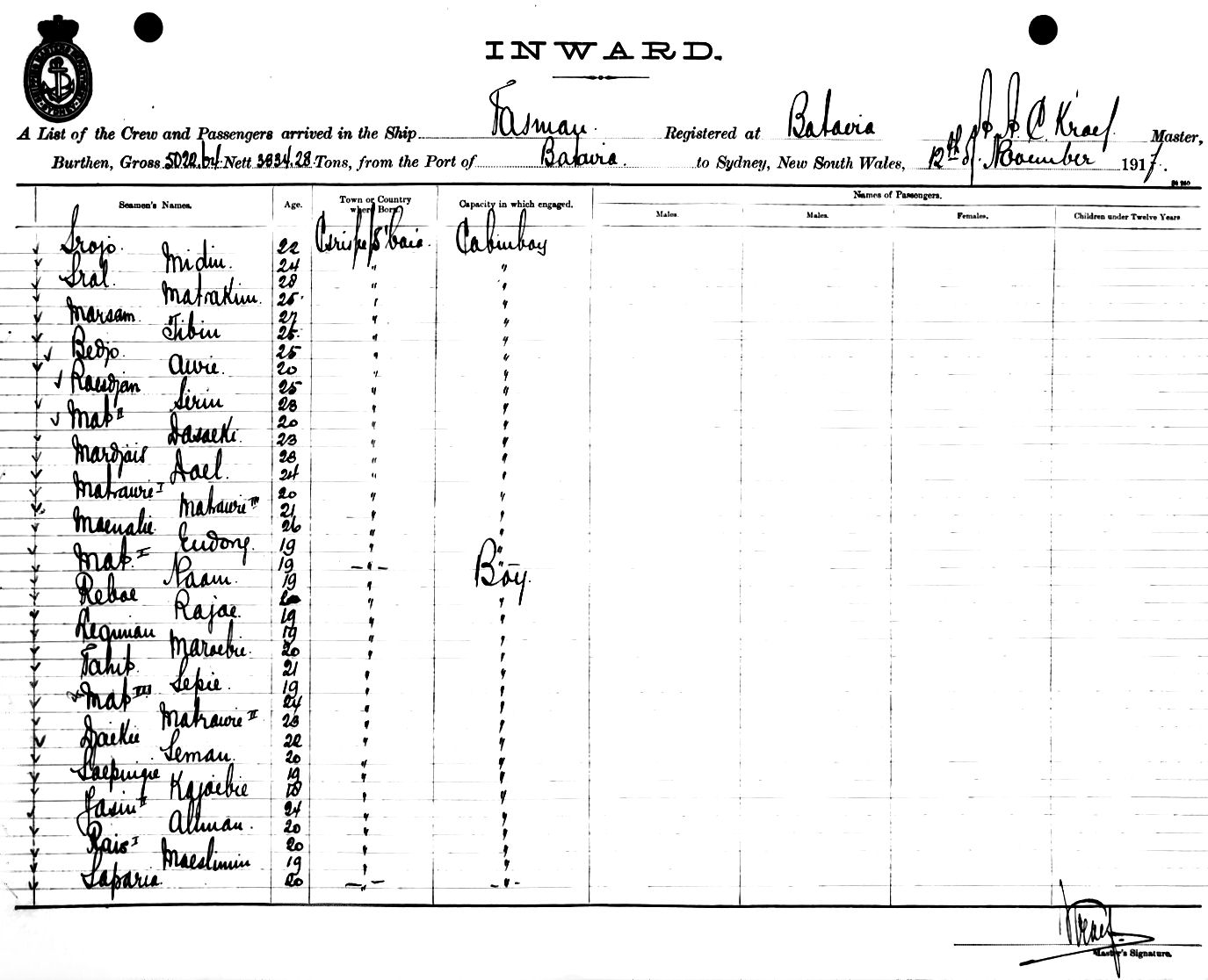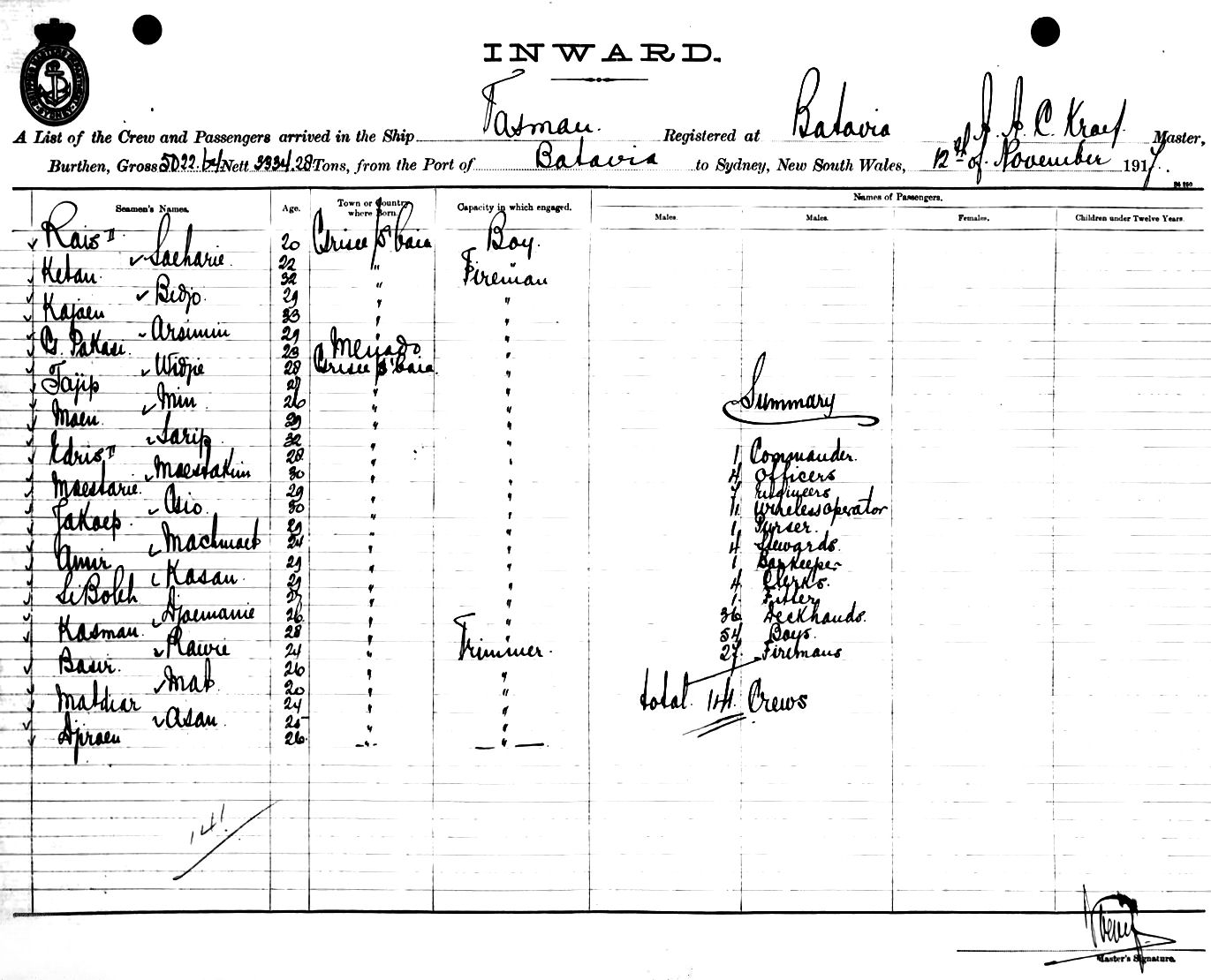 TASMANOF BATAVIA, A. A. C. KROEF, MASTER, BURTHEN 5022/3334 TONS FROM THE PORT OF BATAVIA via BRISBANE TO SYDNEY, NEW SOUTH WALES, 12TH NOVEMBER 1917 |
