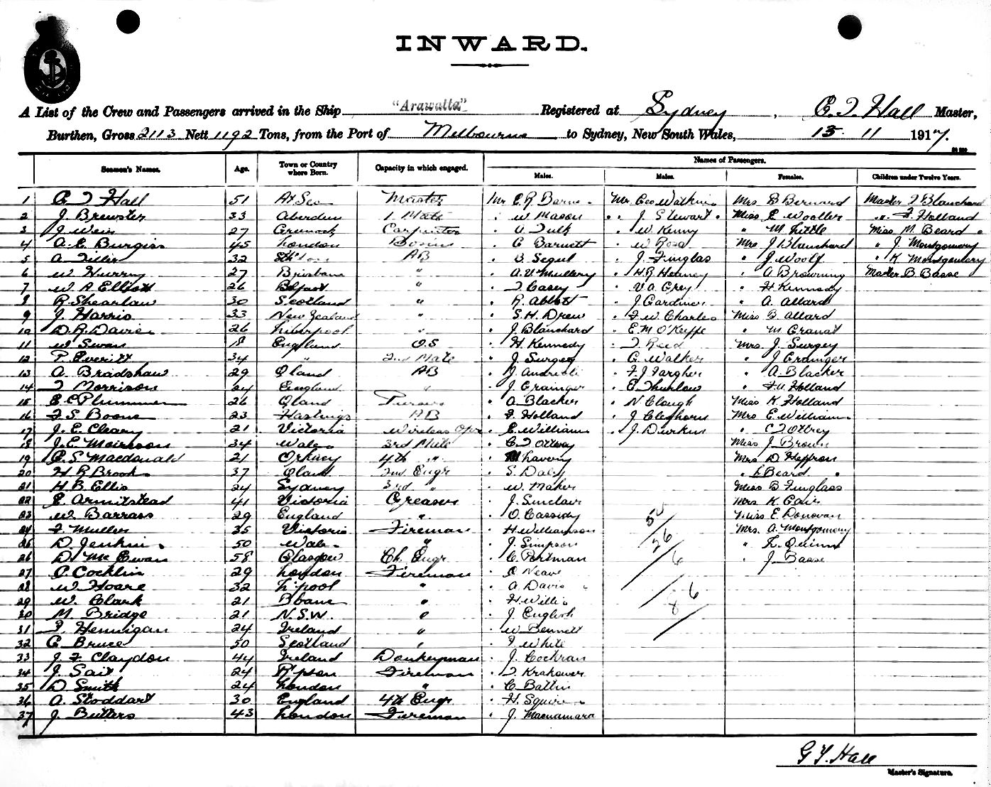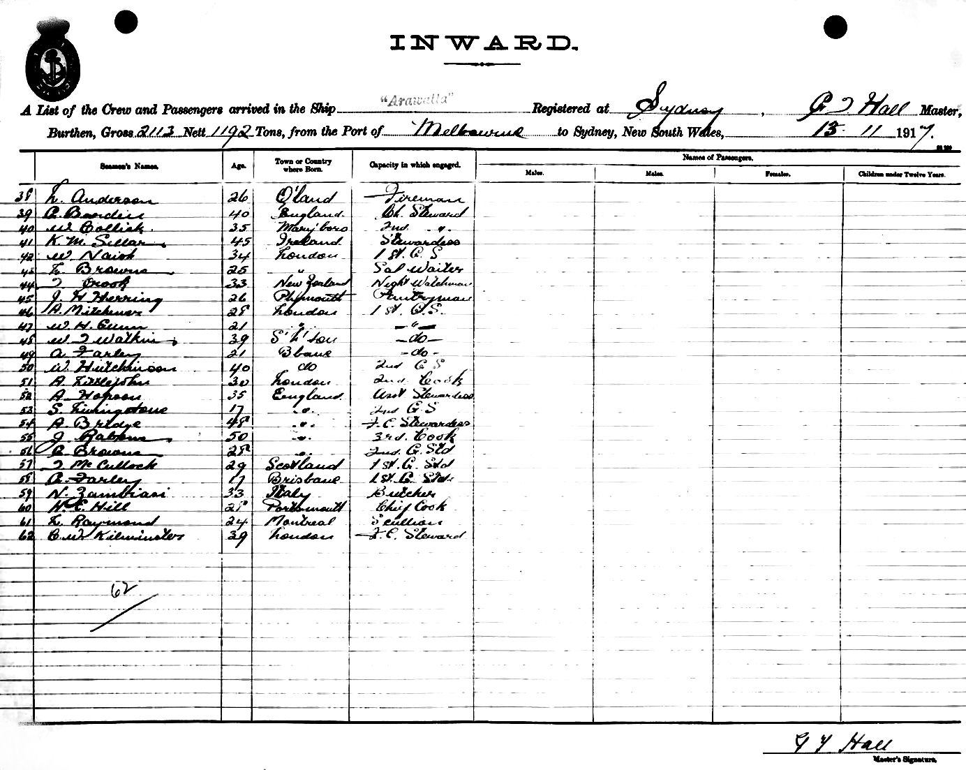 ARAWATTAOF SYDNEY, G. T. HALL, MASTER, BURTHEN 2113/1192 TONS FROM THE PORT OF MELBOURNE TO SYDNEY, NEW SOUTH WALES, 13TH NOVEMBER 1917 |