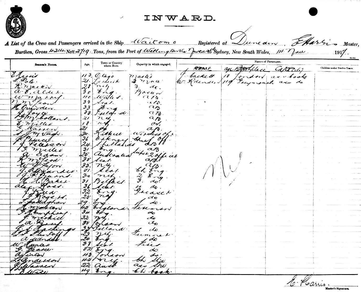 WAITOMOOF DUNEDIN, E. HARRIS, MASTER, BURTHEN 4214/2719 TONS FROM THE PORT OF WELLINGTON via NEWCASTLE TO SYDNEY, NEW SOUTH WALES, 14TH NOVEMBER 1917 |