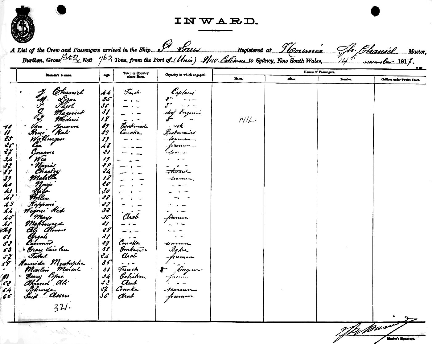 SAINT LOUISOF NOUMEA, JOSEPH CHANIEL, MASTER, BURTHEN 1352/762 TONS FROM THE PORT OF UNIA, NEW CALEDONIA TO SYDNEY, NEW SOUTH WALES, 14TH NOVEMBER 1917 |