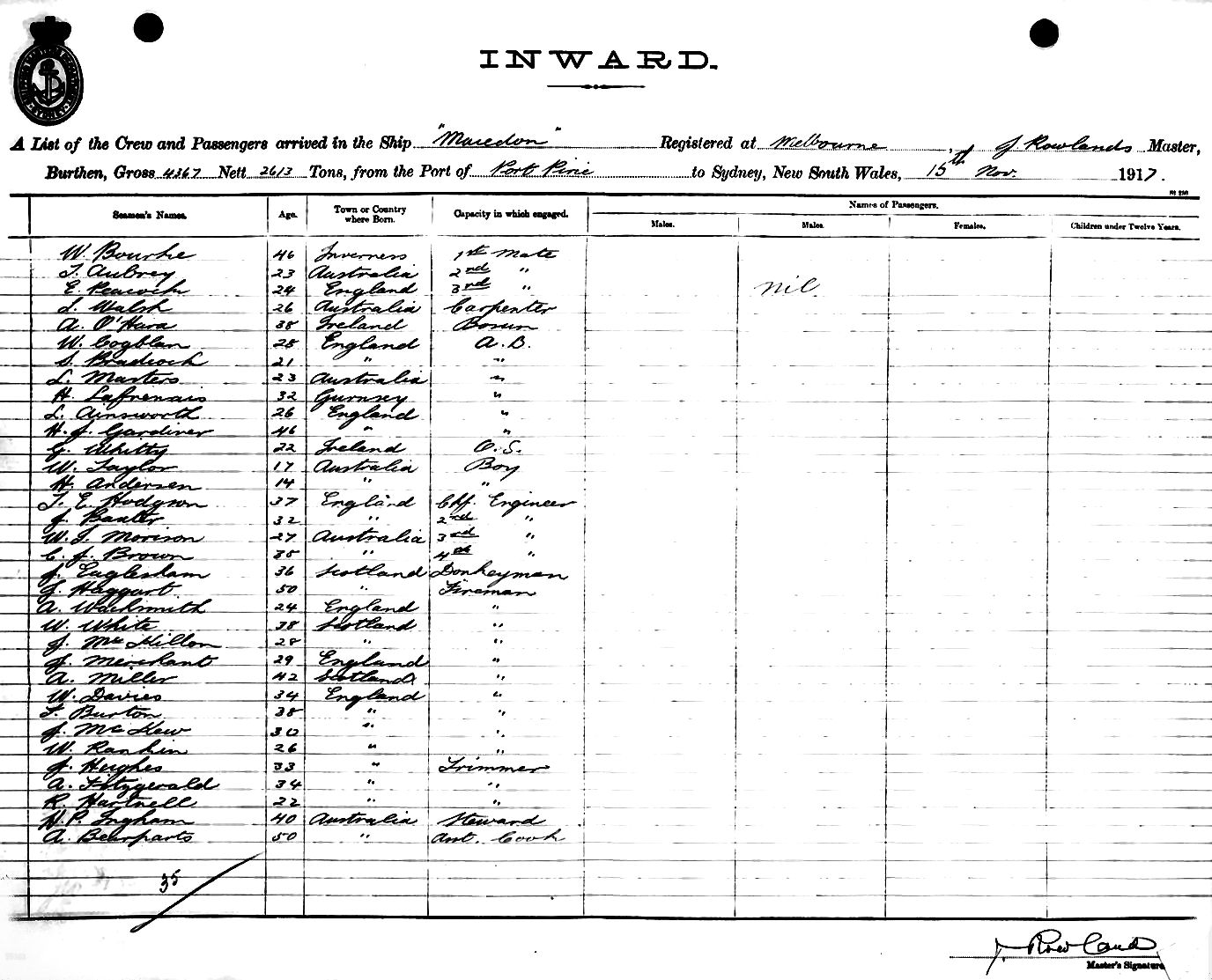 MACEDONOF MELBOURNE, J. ROWLANDS, MASTER, BURTHEN 4367/2613 TONS FROM THE PORT OF PORT PIRIE TO SYDNEY, NEW SOUTH WALES, 15TH NOVEMBER 1917 |