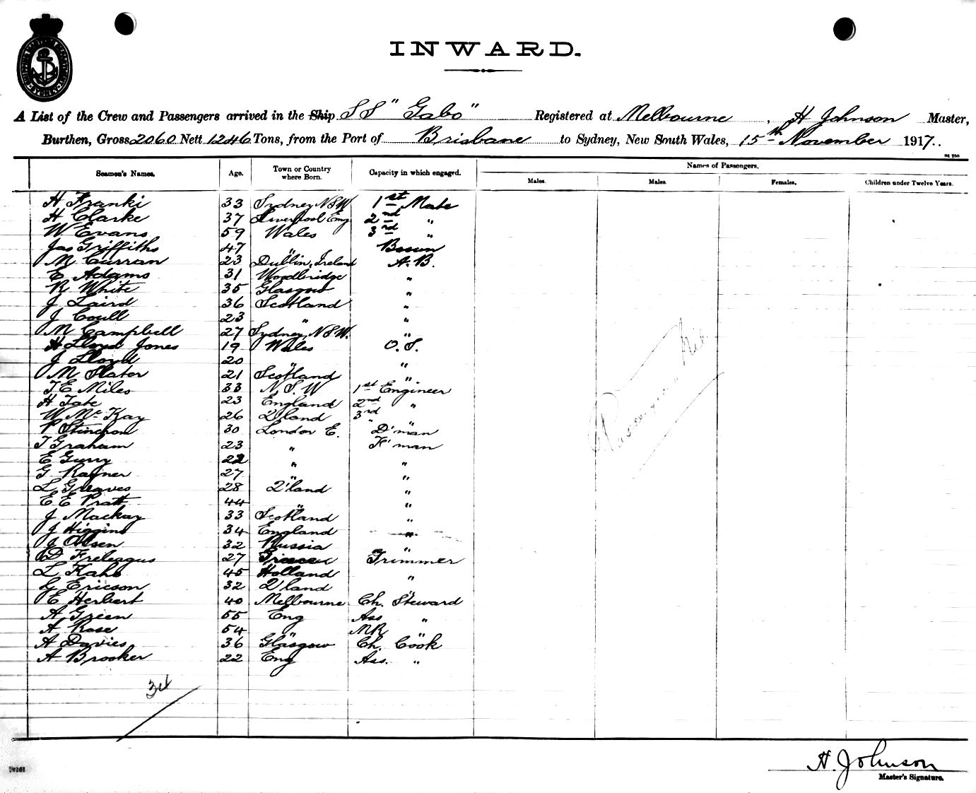 GABOOF MELBOURNE, H. JOHNSON, MASTER, BURTHEN 2060/1246 TONS FROM THE PORT OF BRISBANE TO SYDNEY, NEW SOUTH WALES, 15TH NOVEMBER 1917 |