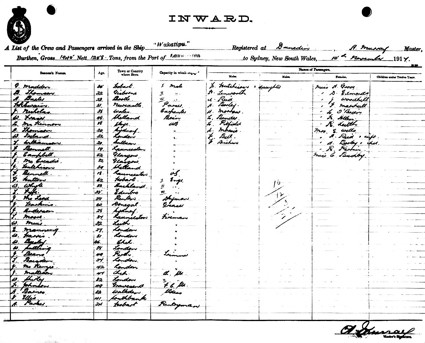 WAKATIPUOF DUNEDIN, A. MURRAY, MASTER, BURTHEN 1945/1258 TONS FROM THE PORT OF LAUNCESTON TO SYDNEY, NEW SOUTH WALES, 15TH NOVEMBER 1917 |