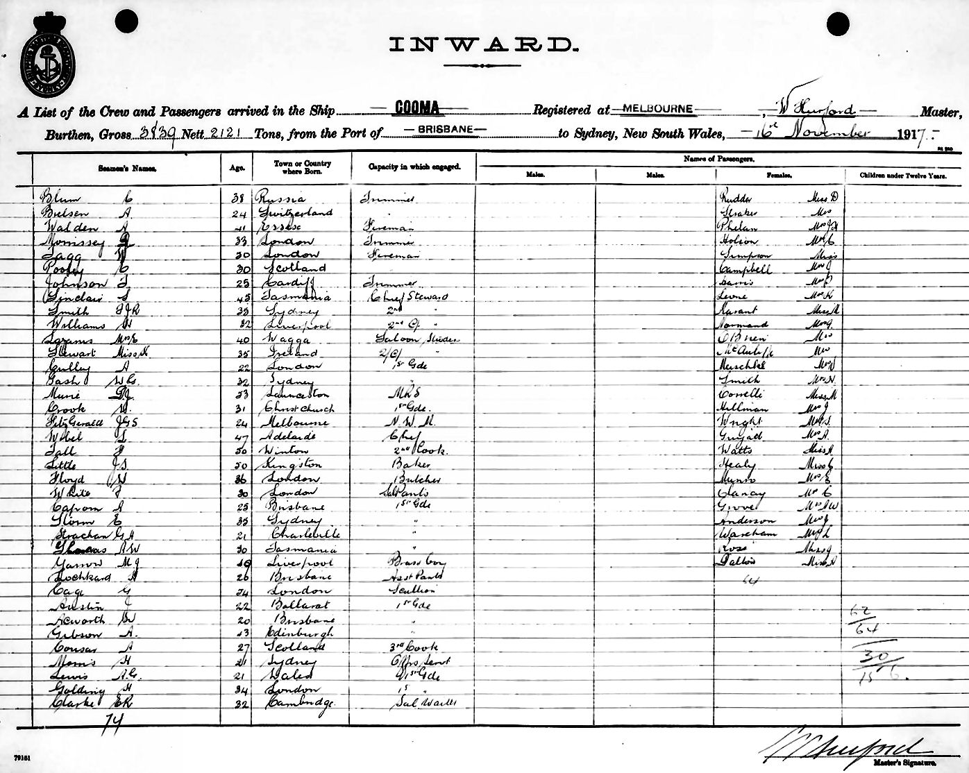 COOMAOF MELBOURNE, W. HURFORD, MASTER, BURTHEN 3839/2121 TONS FROM THE PORT OF BRISBANE TO SYDNEY, NEW SOUTH WALES, 16TH NOVEMBER 1917 |