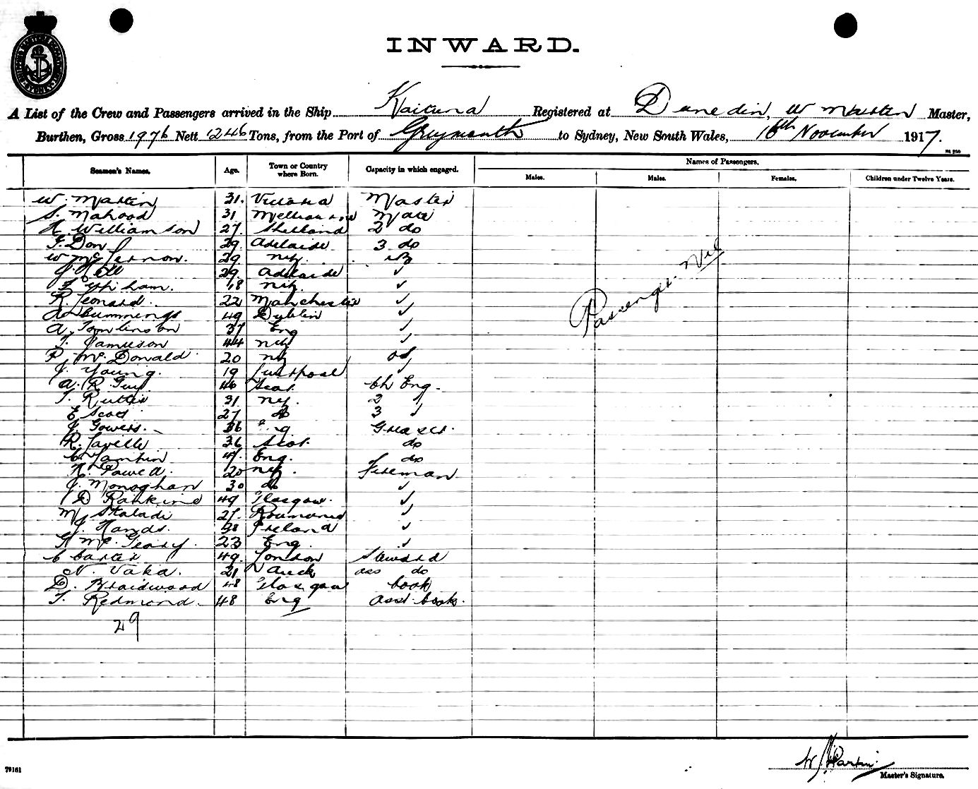KAITUNAOF DUNEDIN, W. MARTIN, MASTER, BURTHEN 1976/1246 TONS FROM THE PORT OF GREYMOUTH, N.Z. TO SYDNEY, NEW SOUTH WALES, 16TH NOVEMBER 1917 |