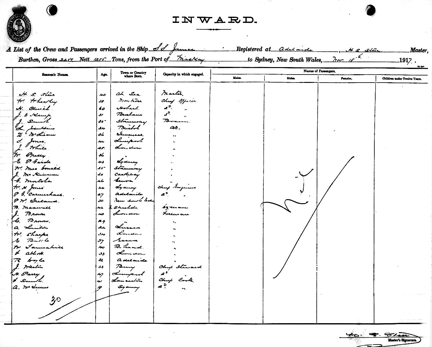 JUNEEOF ADELAIDE, H. S. STEER, MASTER, BURTHEN 2217/1255 TONS FROM THE PORT OF MACKAY TO SYDNEY, NEW SOUTH WALES, 18TH NOVEMBER 1917 |
