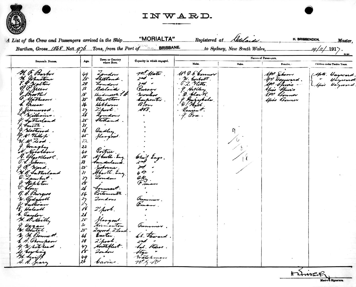 Mariners and ships in Australian Waters | MORIALTAOF ADELAIDE, H. BRISSENDEN, MASTER, BURTHEN 1848/976 TONS FROM THE PORT OF CAIRNS via BRISBANE TO SYDNEY, NEW SOUTH WALES, 19TH NOVEMBER 1917 |