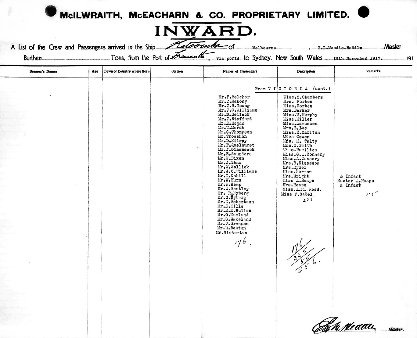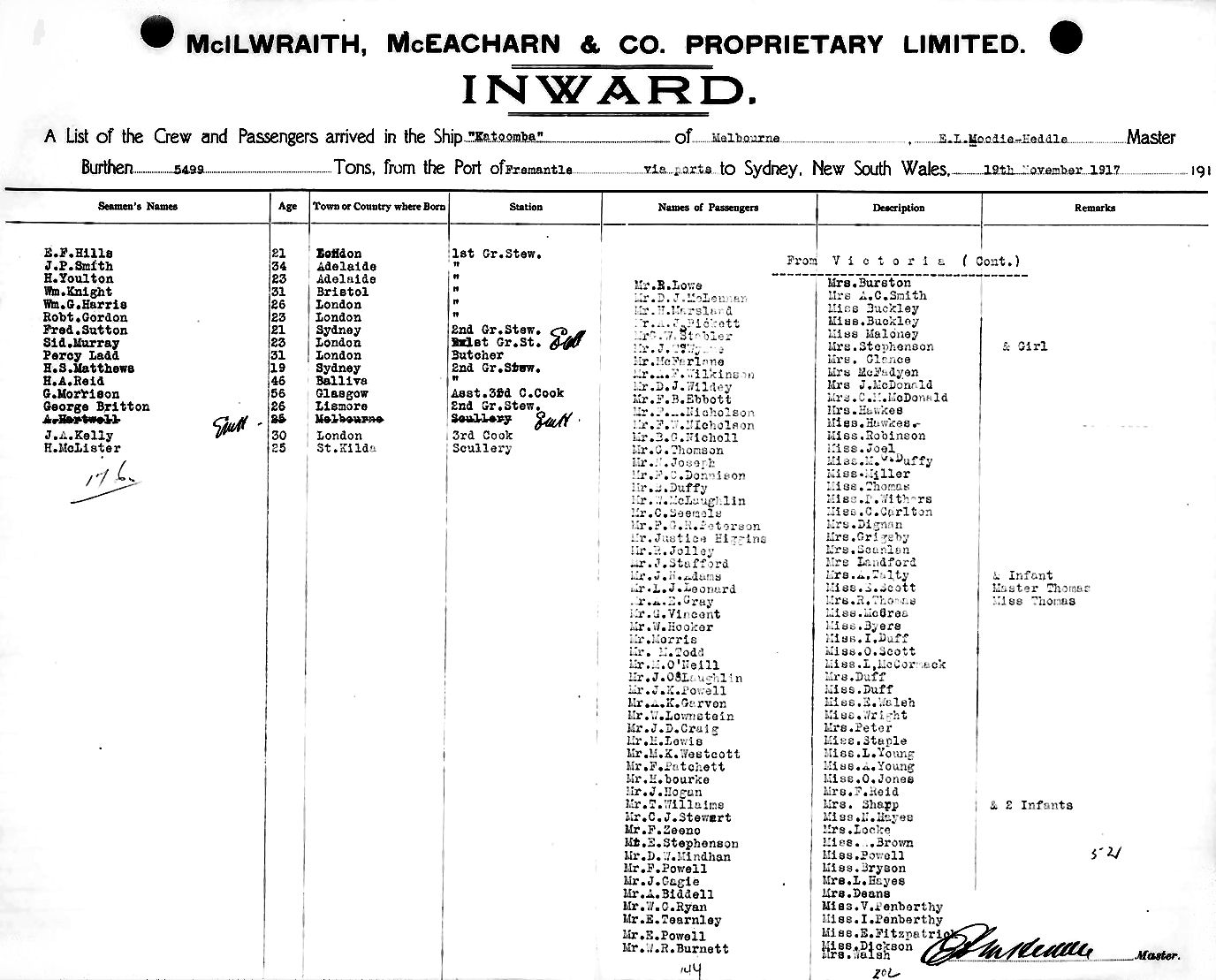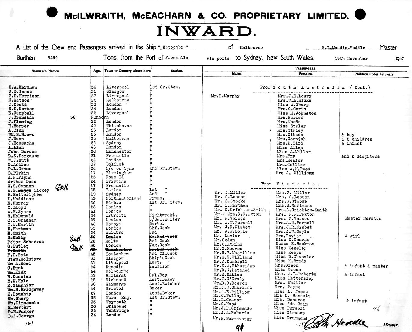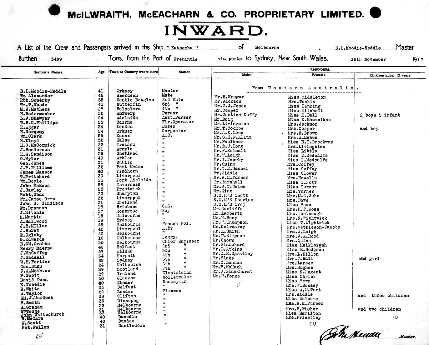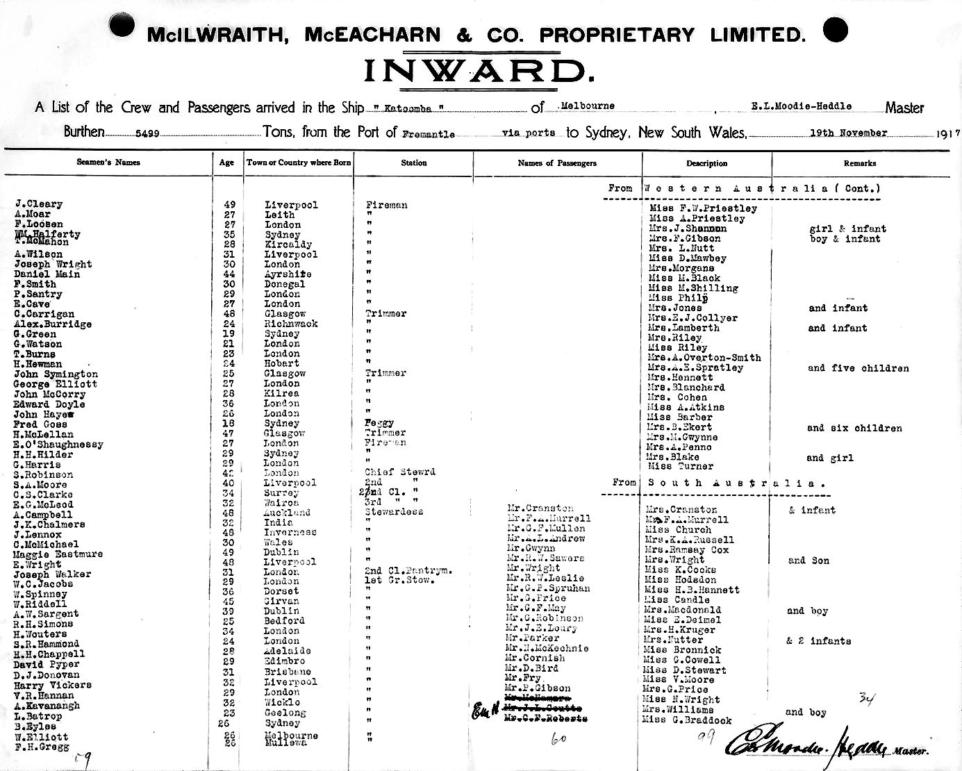 KATOOMBAOF MELBOURNE, E. L. MOODIE-HEDDLE, MASTER, BURTHEN 5499 TONS FROM THE PORT OF FREMANTLE, ADELAIDE & MELBOURNE TO SYDNEY, 19TH NOVEMBER 1917 |