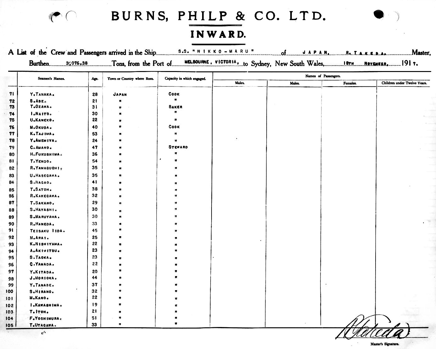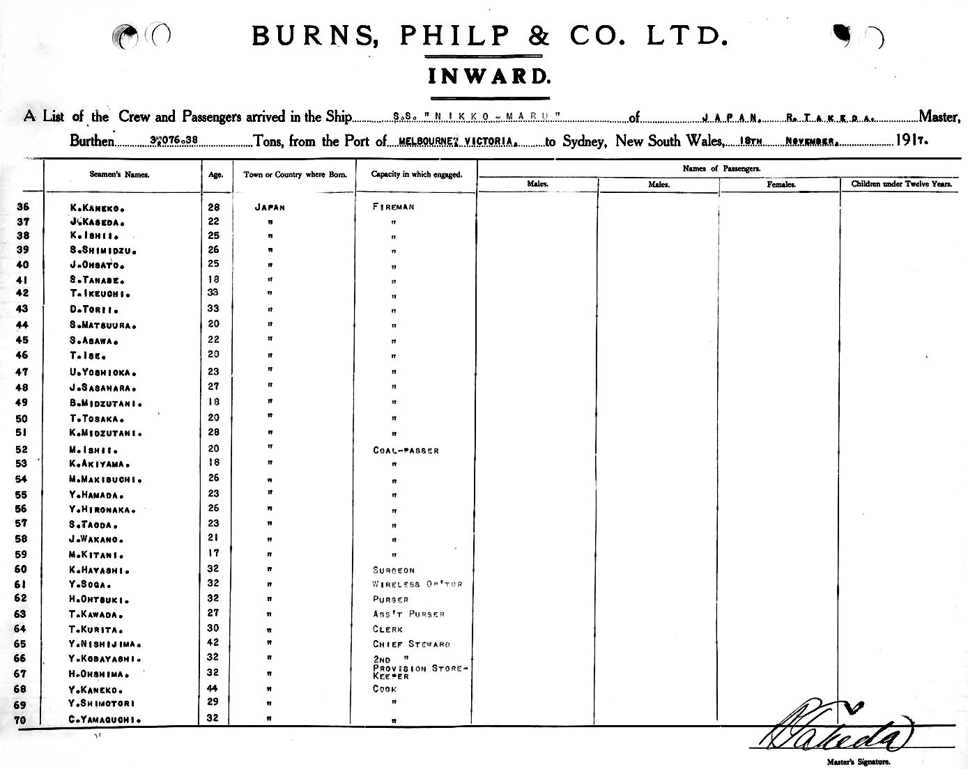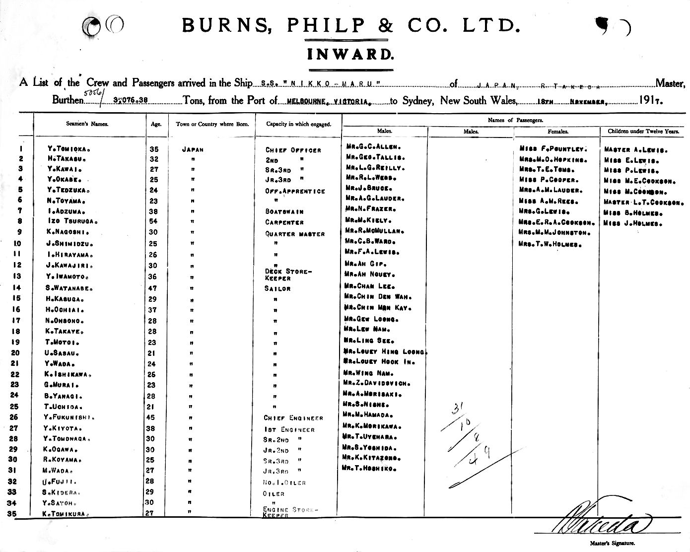 NIKKO MARUOF JAPAN, R. TAKEDA, MASTER, BURTHEN 5056/3076 TONS FROM THE PORT OF MELBOURNE TO SYDNEY, NEW SOUTH WALES, 18TH NOVEMBER 1917 |