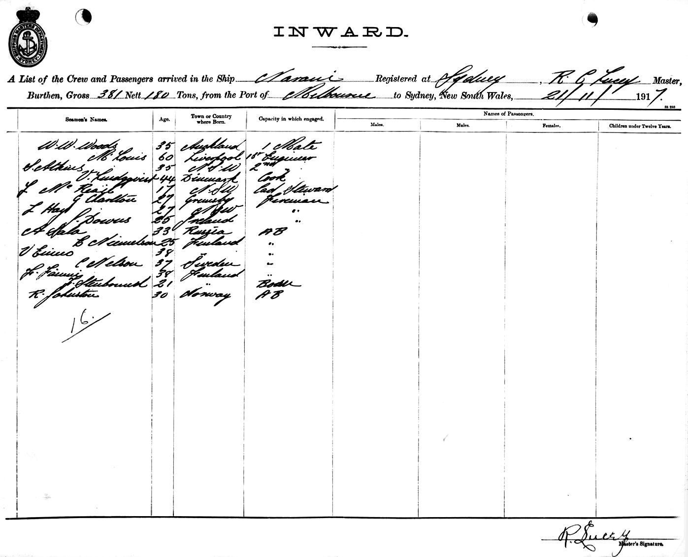 NARANIOF SYDNEY, R. C. LUCEY, MASTER, BURTHEN 381/18068 TONS FROM THE PORT OF MELBOURNE TO SYDNEY, NEW SOUTH WALES, 21ST NOVEMBER 1917 |