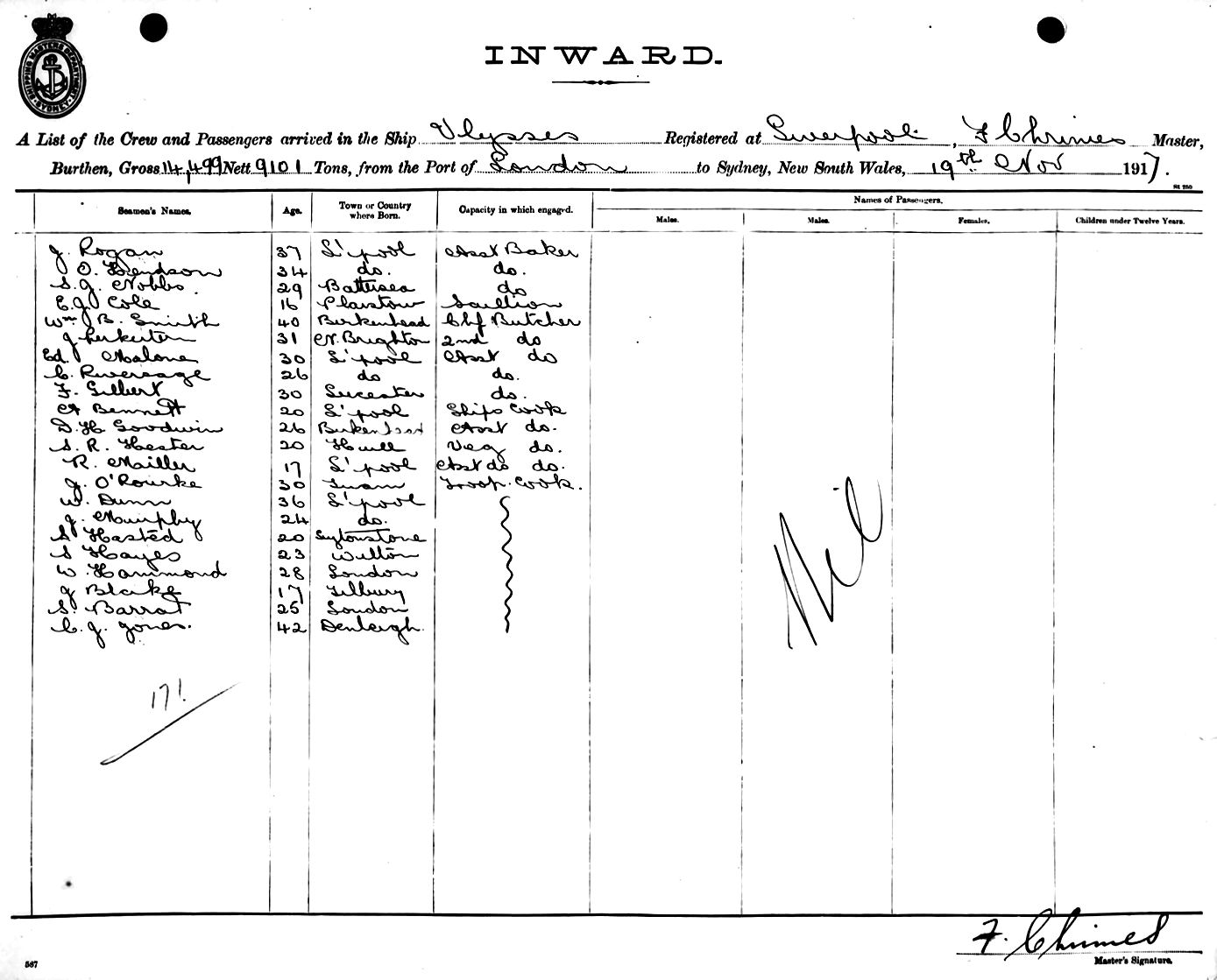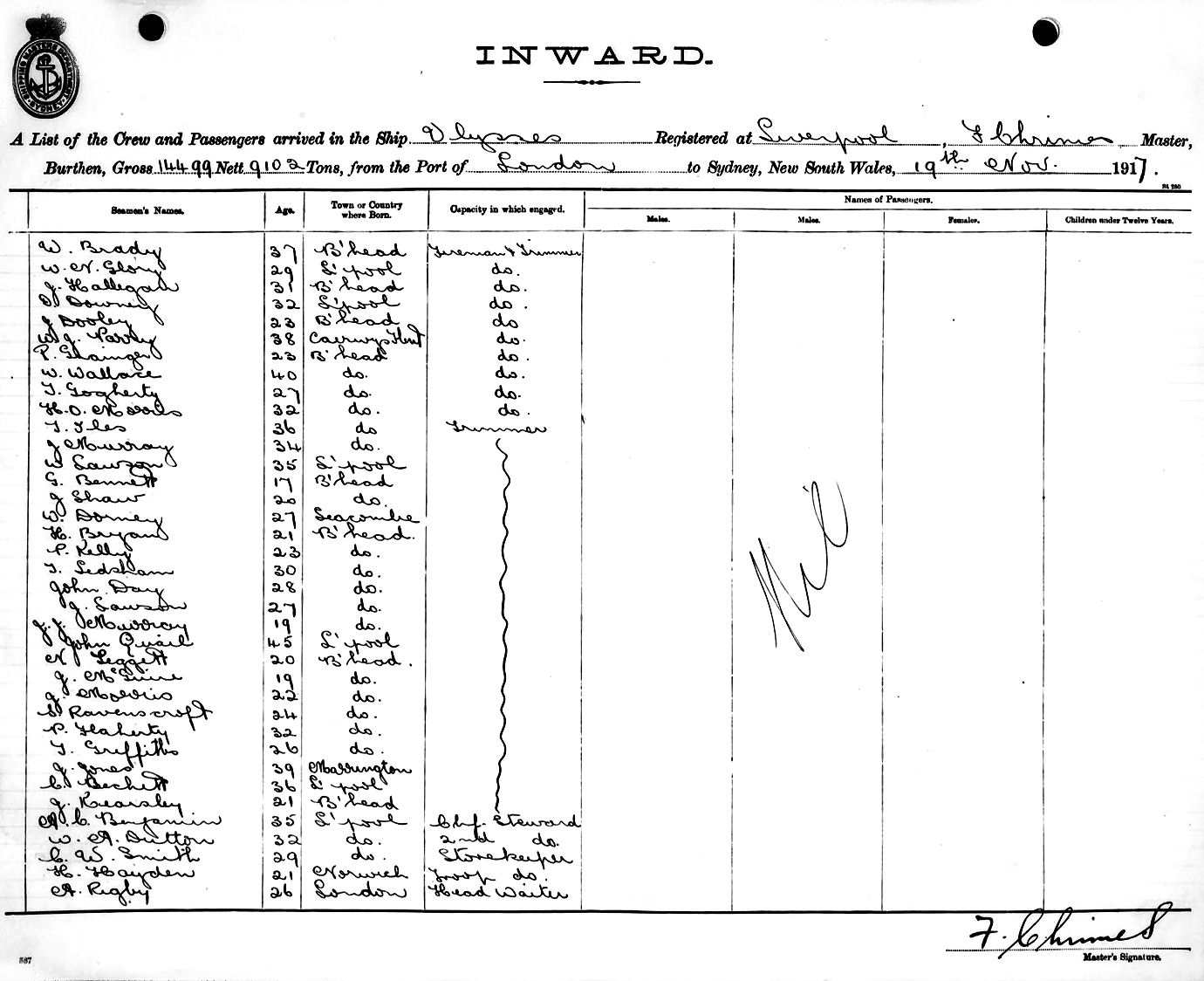 Mariners and ships in Australian Waters | ULYSSESOF LIVERPOOL, F. CHRIMES, MASTER, BURTHEN 14,.499/9,101 TONS FROM THE PORT OF LONDON via MELBOURNE, NEW SOUTH WALES, 19TH NOVEMBER 1917 |