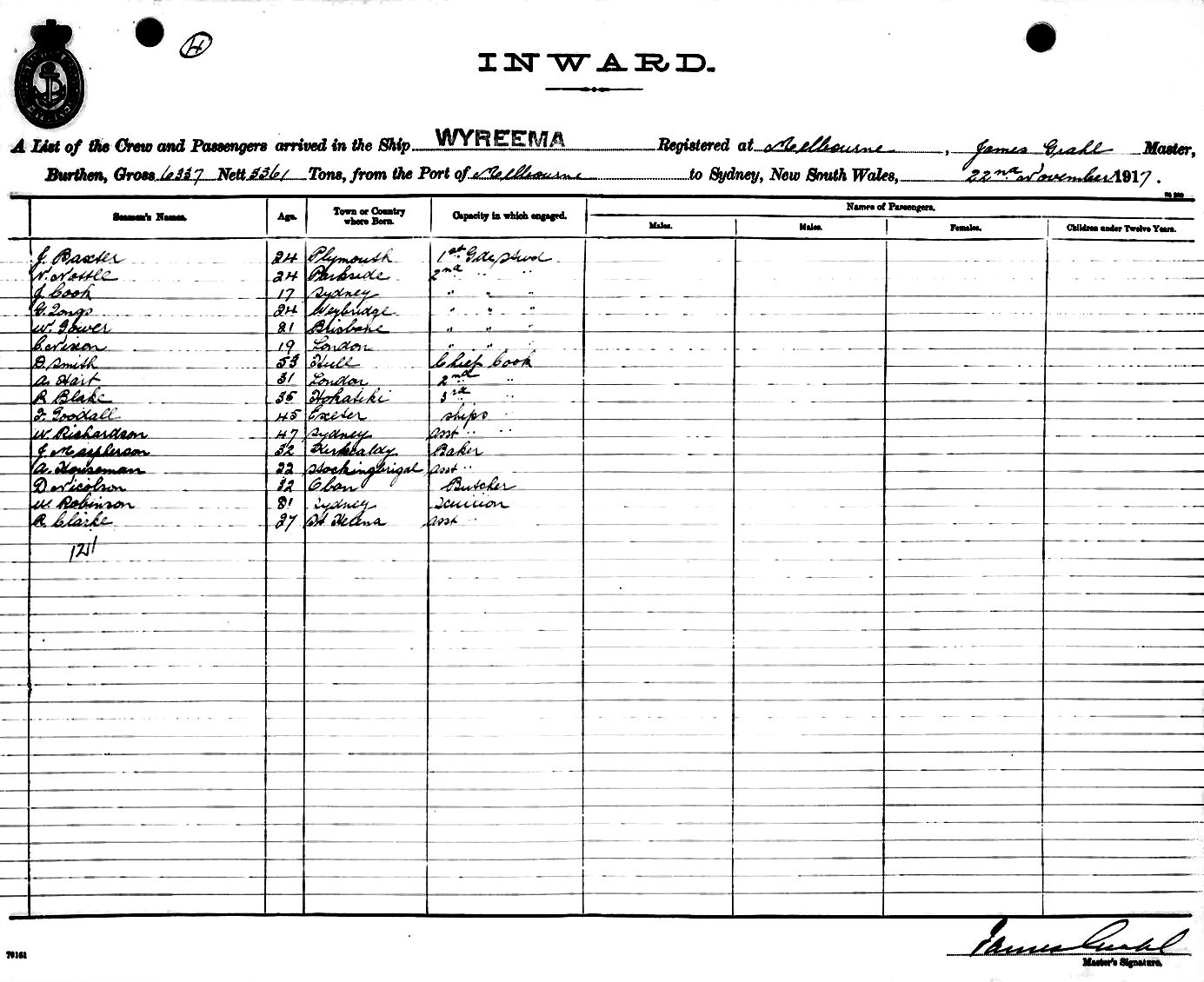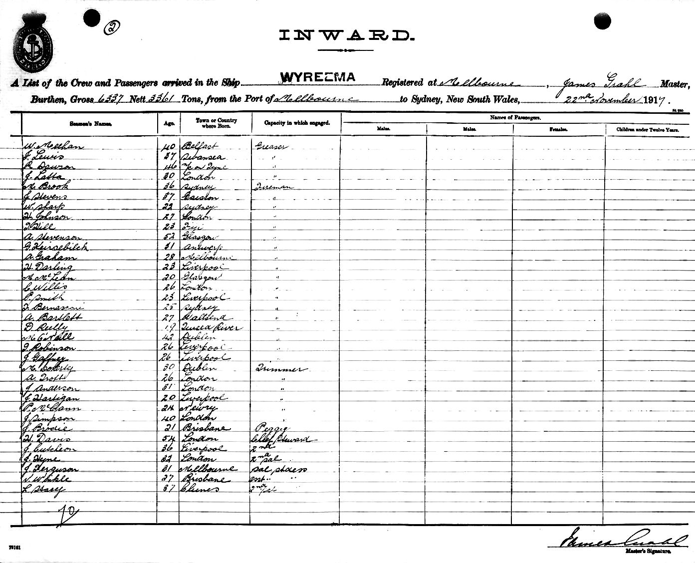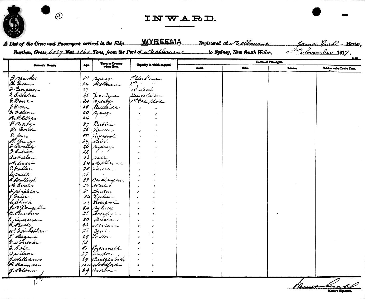 WYREEMAOF MELBOURNE, JAMES GRAHL, MASTER, BURTHEN 6337/3361 TONS FROM THE PORT OF MELBOURNE TO SYDNEY, NEW SOUTH WALES, 22ND NOVEMBER 1917 |
