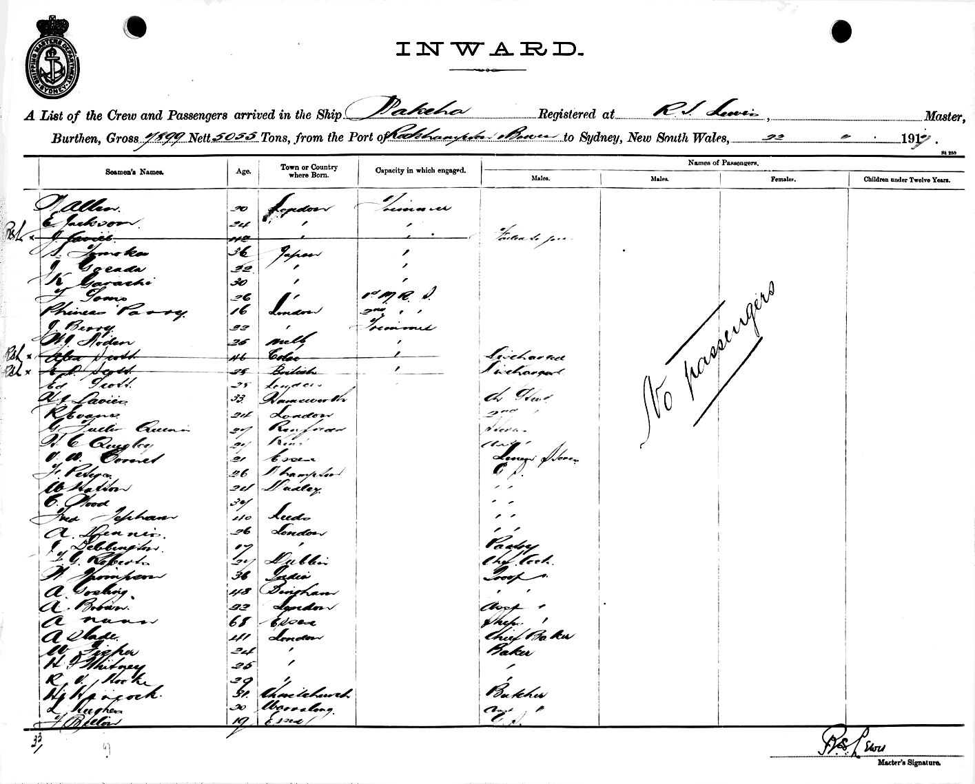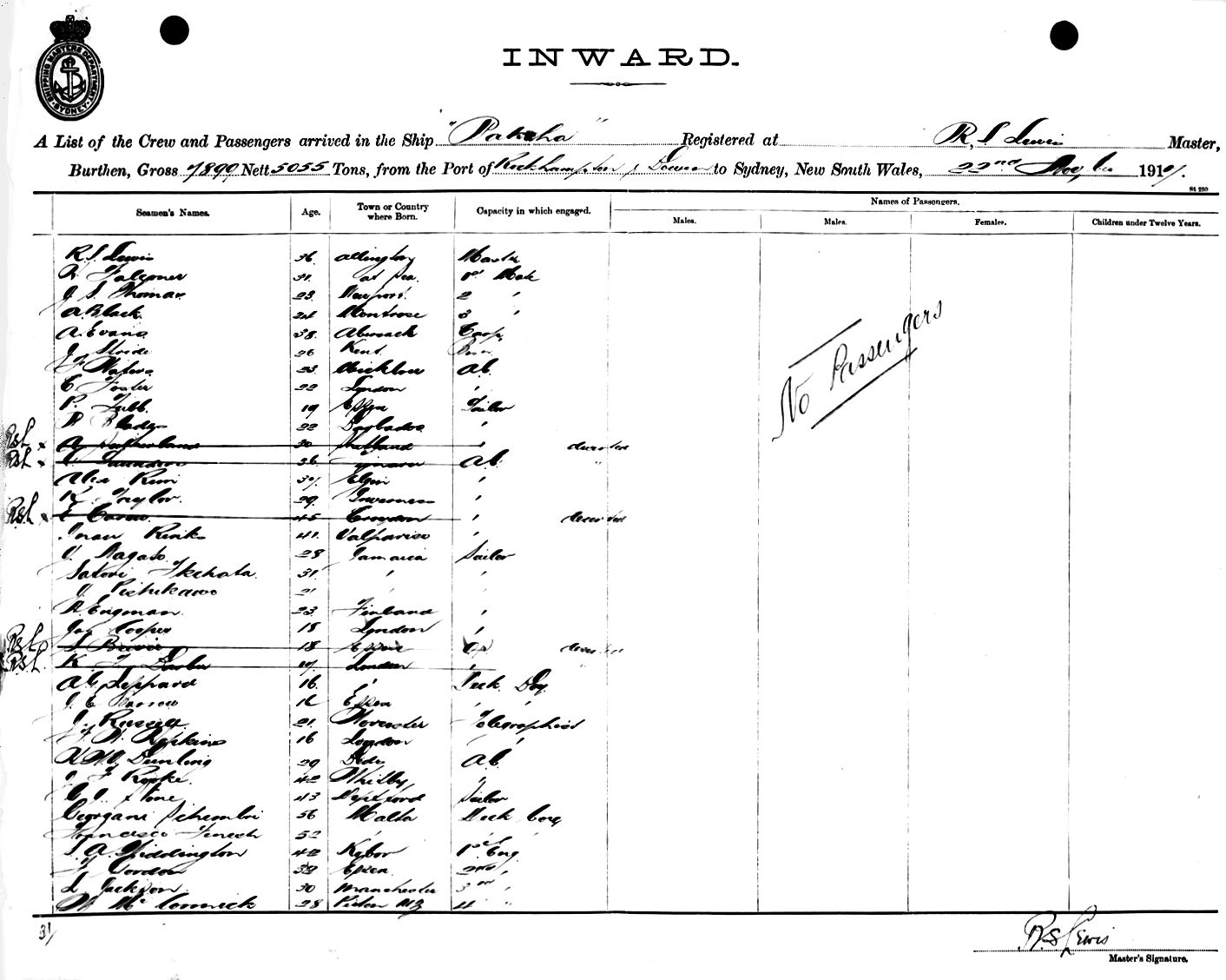 PAKEHAOF (SOUTHAMPTON), R. S. LEWIS, MASTER, BURTHEN 7899/5055 TONS FROM THE PORTS OF ROCKHAMPTON & BOWEN TO SYDNEY, NEW SOUTH WALES, 22ND NOVEMBER 1917 |