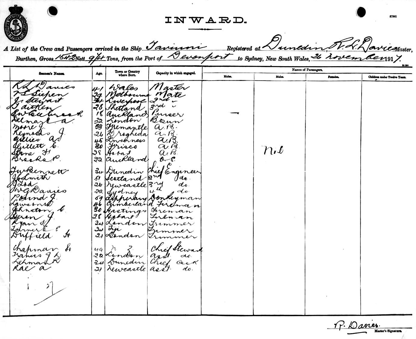 TAVIUNIOF DUNEDIN, R. L. DAVIES, MASTER, BURTHEN 1542/974 TONS FROM THE PORT OF DEVONPORT TO SYDNEY, NEW SOUTH WALES, 26TH NOVEMBER 1917 |