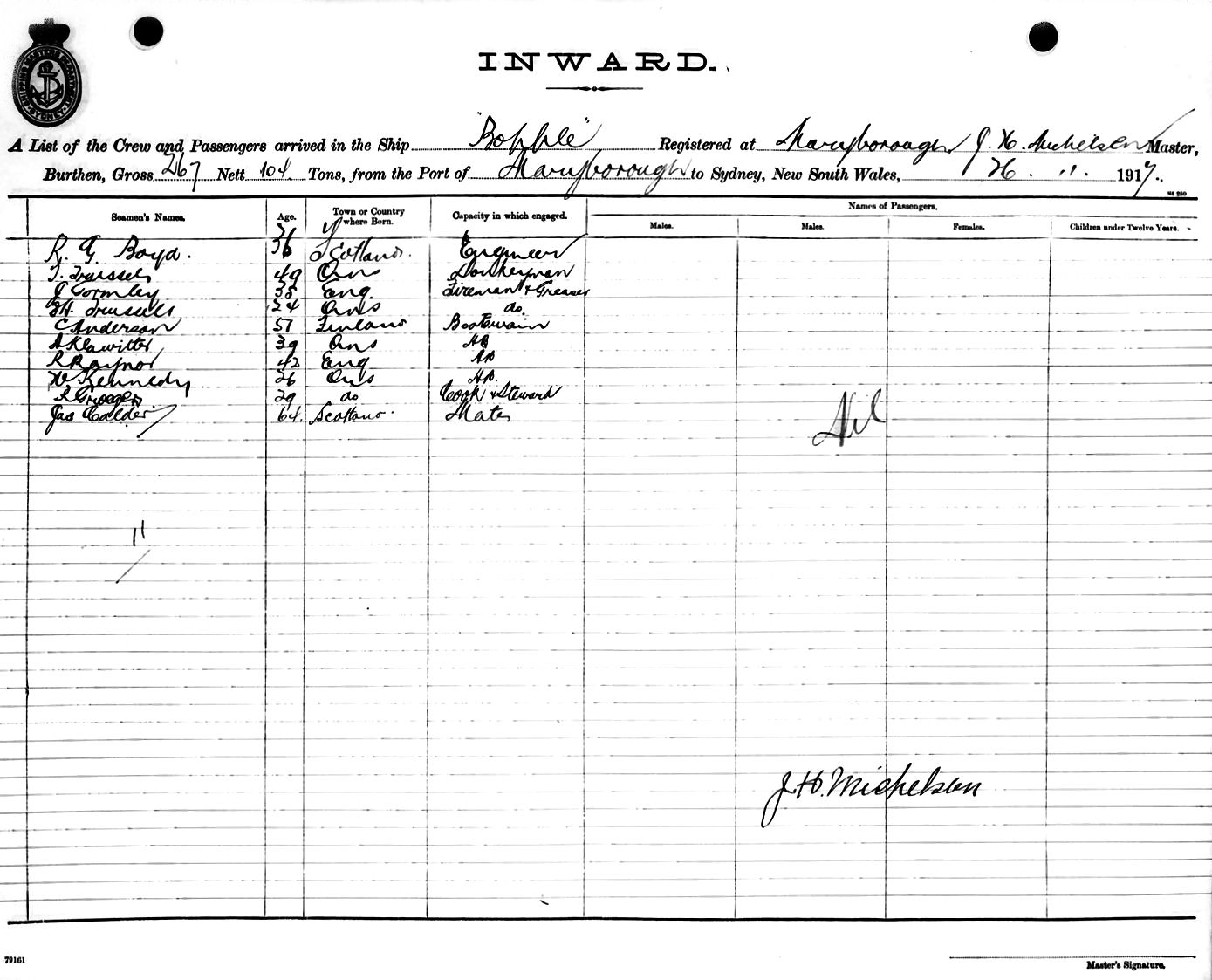 BOPPLEOF MARYBOROUGH, J. H. MICHELSEN, MASTER, BURTHEN 267/104 TONS FROM THE PORT OF MARYBOROUGH TO SYDNEY, NEW SOUTH WALES, 26TH NOVEMBER 1917 |