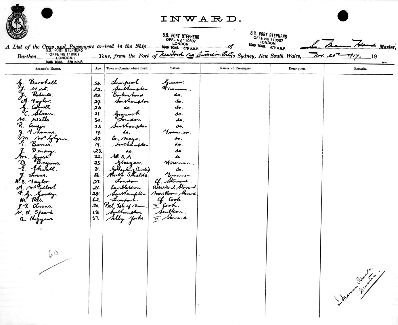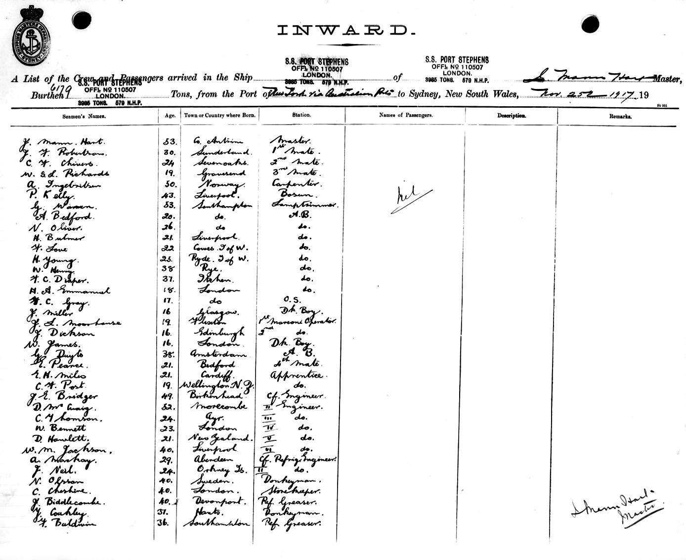Mariners and ships in Australian Waters | PORT STEPHENSOF LONDON, J. MANN HART, MASTER, BURTHEN 6179 TONS FROM THE PORT OF NEW YORK via AUSTRALIAN PORTS TO SYDNEY, NEW SOUTH WALES, 25TH NOVEMBER 1917 |