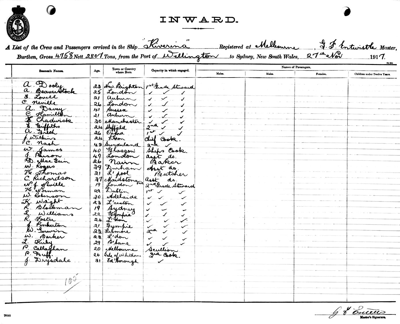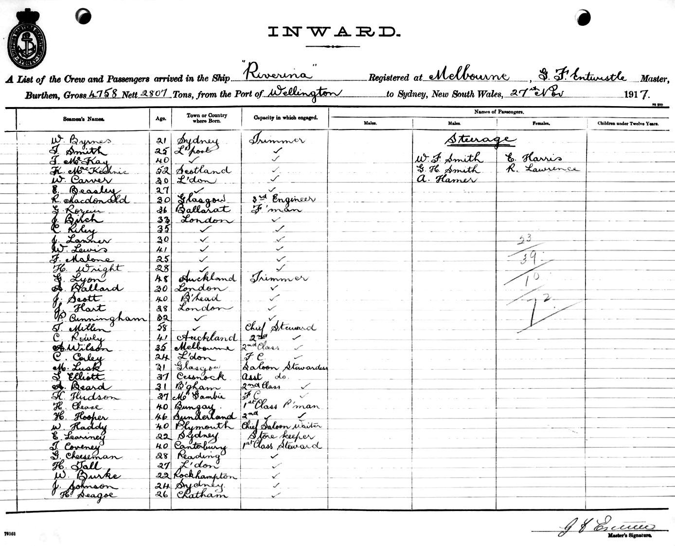 RIVERINAOF MELBOURNE, G. F. ENTWISLE, MASTER, BURTHEN 4758/2807 TONS FROM THE PORT OF WELLINGTON TO SYDNEY, NEW SOUTH WALES, 27TH NOVEMBER 1917 |