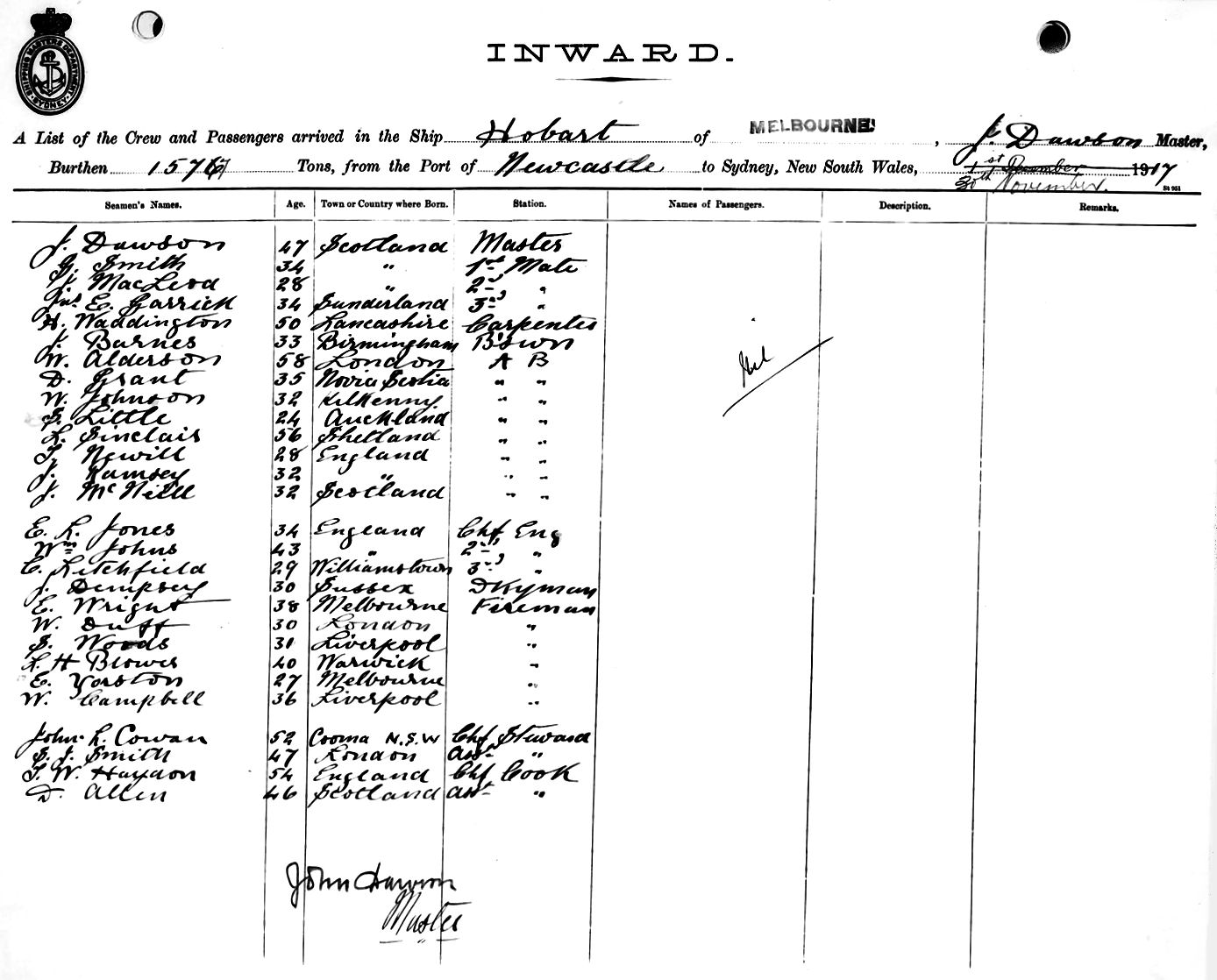 Mariners and ships in Australian Waters | HOBARTOF MELBOURNE, J. DAWSON, MASTER, BURTHEN 1577 TONS FROM THE PORT OF NEWCASTLE TO SYDNEY, NEW SOUTH WALES, 30TH NOVEMBER 1917 |