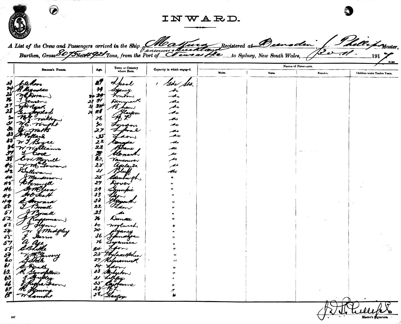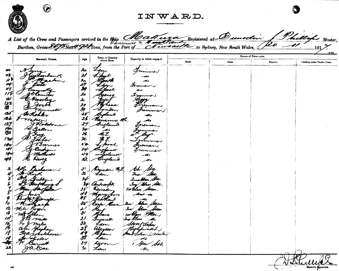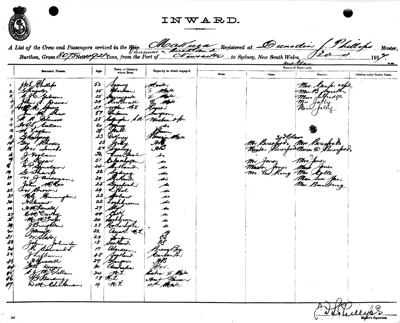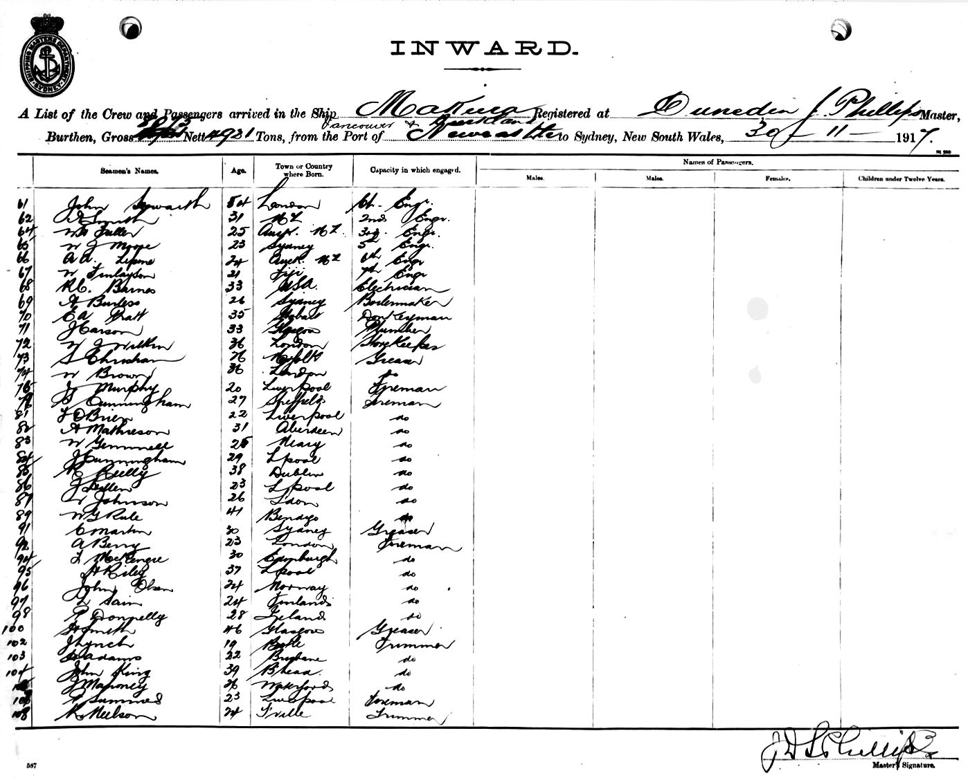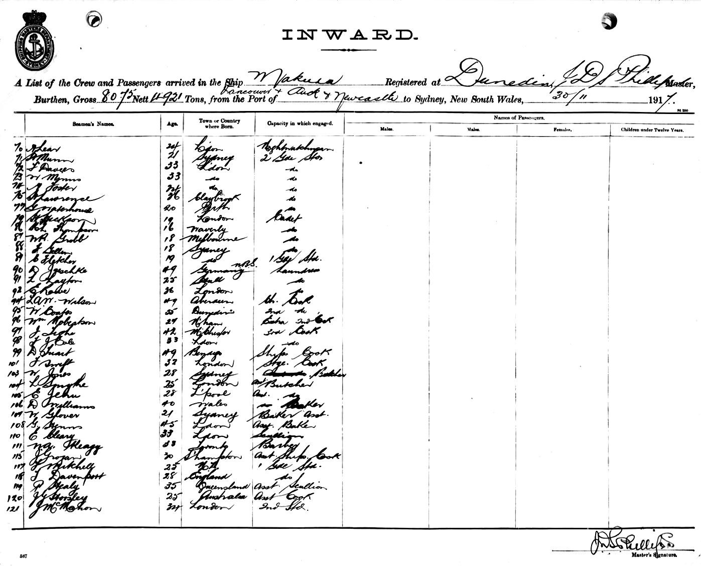 Mariners and ships in Australian Waters | MAKURAOF DUNEDIN, J. D. S. PHILLIPS, MASTER, BURTHEN 8075/4921 TONS FROM THE PORT OF VANCOUVER via AUCKLAND & NEWCASTLE TO SYDNEY, NEW SOUTH WALES, 30TH NOVEMBER 1917 |