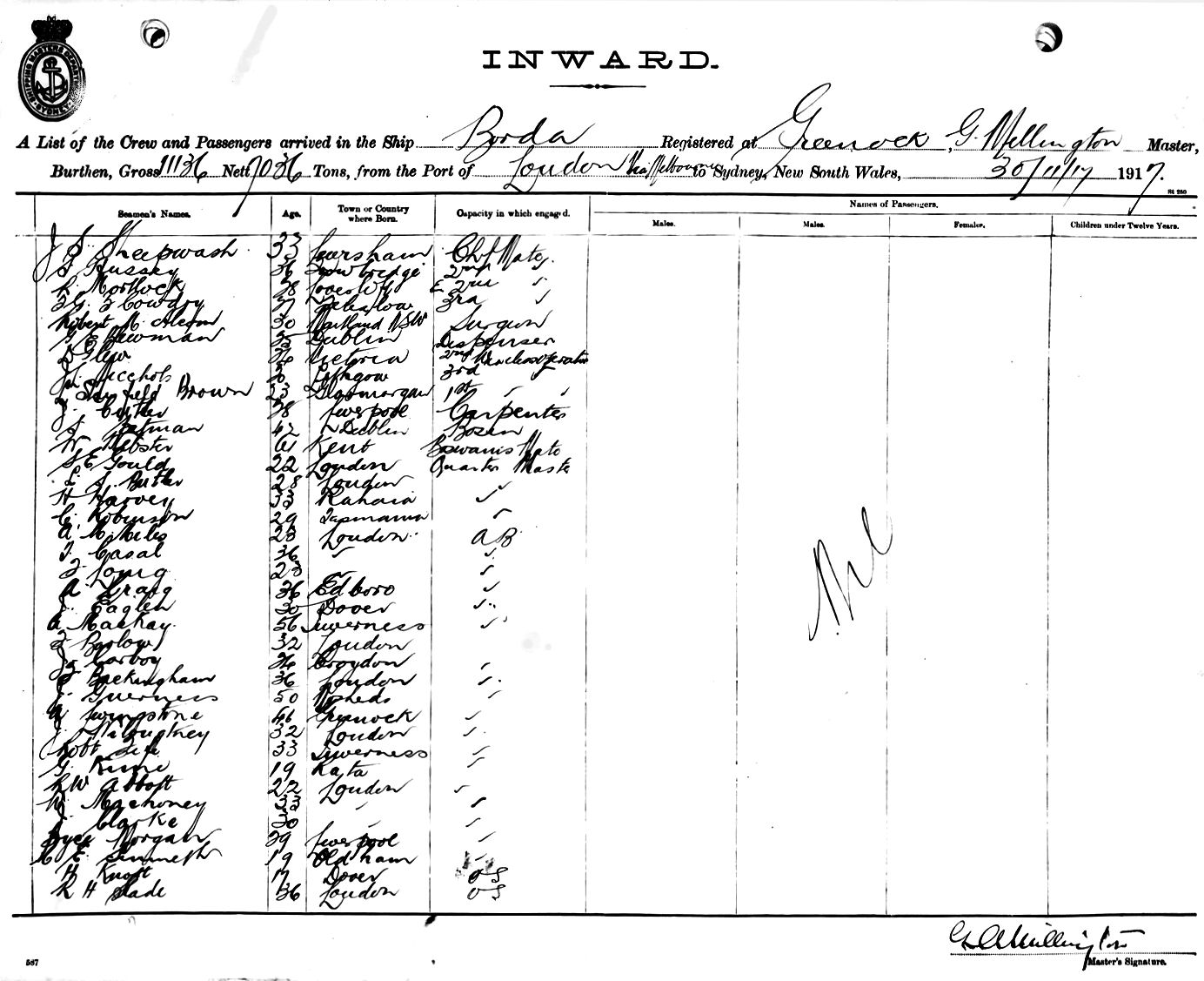 Mariners and ships in Australian Waters | BORDAOF GREEOCK, G. MILLINGTON, MASTER, BURTHEN 11136/9036 TONS FROM THE PORT OF LONDON via MELBOURNE TO SYDNEY, NEW SOUTH WALES, 30TH NOVEMBER 1917 |