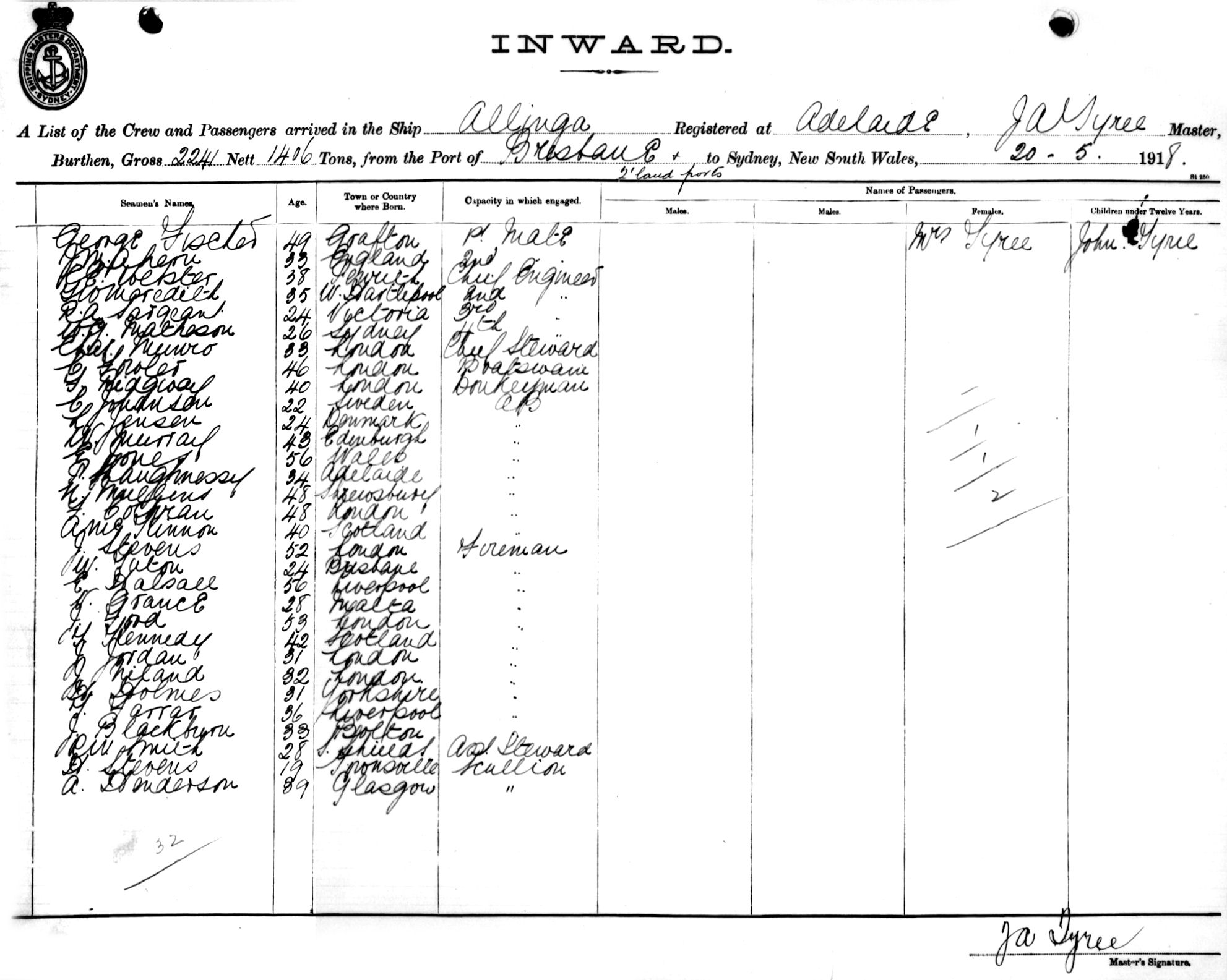 ALLINGAOF ADELAIDE, J. A. TYREE, MASTER, BURTHEN 2241 / 1406 TONS FROM PORT OF BRISBANE & QUEENSLAND PORTS TO SYDNEY, NEW SOUTH WALES, 20TH MAY 1918 |