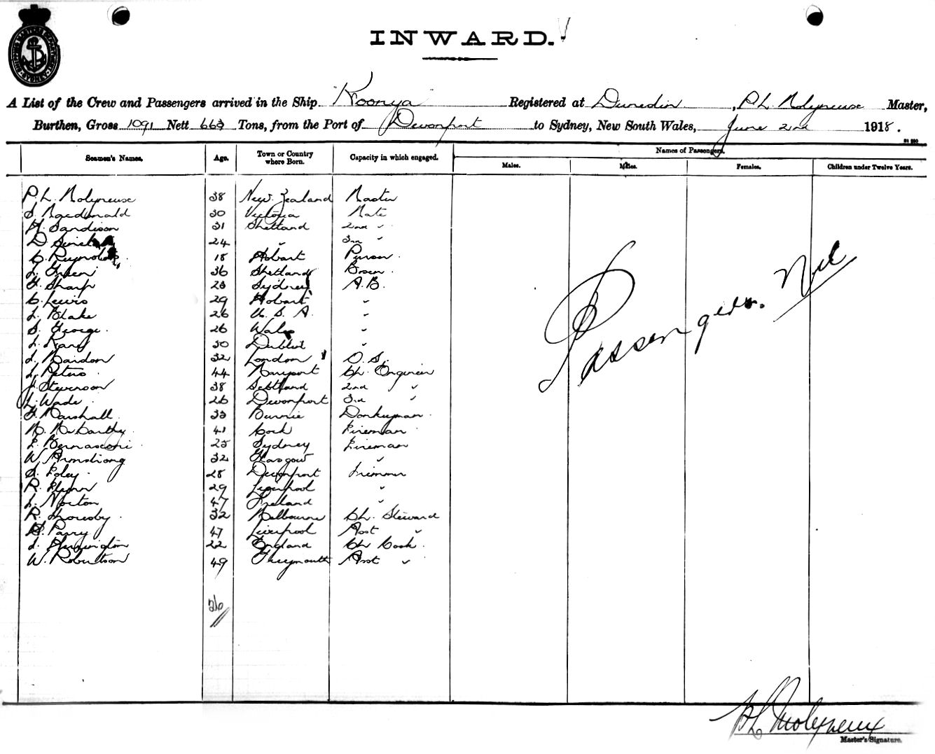KOONYAOF DUNEDIN, P.L. MOLYNEUX, MASTER, BURTHEN 1091/663 TONS FROM THE PORT OF DEVONPORT TO SYDNEY, NEW SOUTH WALES, 2ND JUNE 1918 |