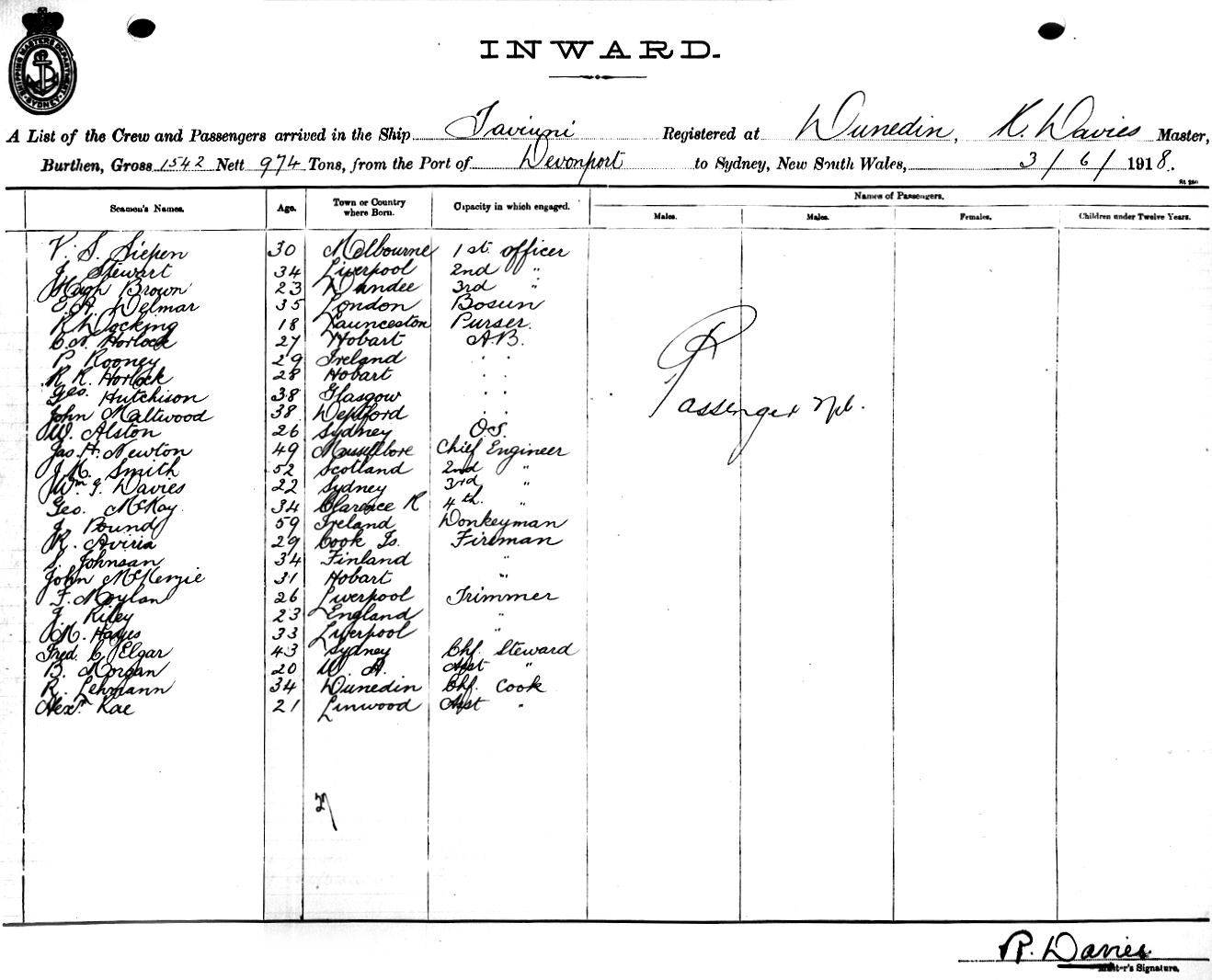 TAVIUNIOF DUNEDIN, K. DAVIES, MASTER, BURTHEN 1542/974 TONS FROM THE PORT OF DEVONPORT TO SYDNEY, NEW SOUTH WALES, 3RD JUNE 1918 |