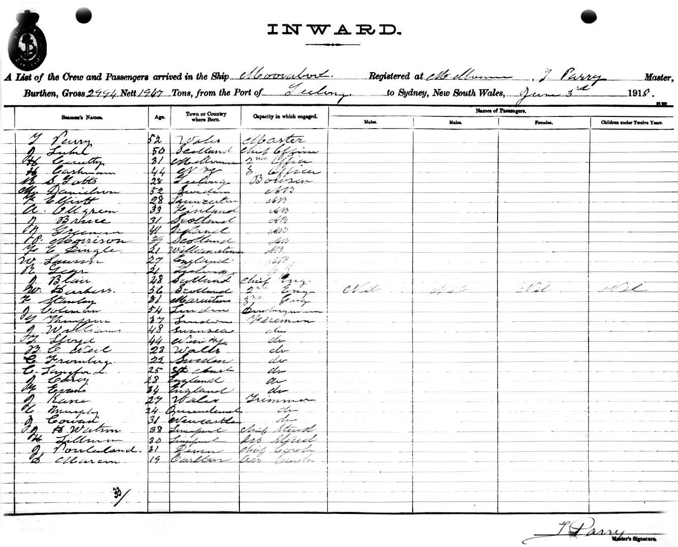 MOORABOOLOF MELBOURNE, T. PARRY, MASTER, BURTHEN 2994/1947 TONS FROM THE PORT OF GEELONG TO SYDNEY, NEW SOUTH WALES, 3RD JUNE 1918 |