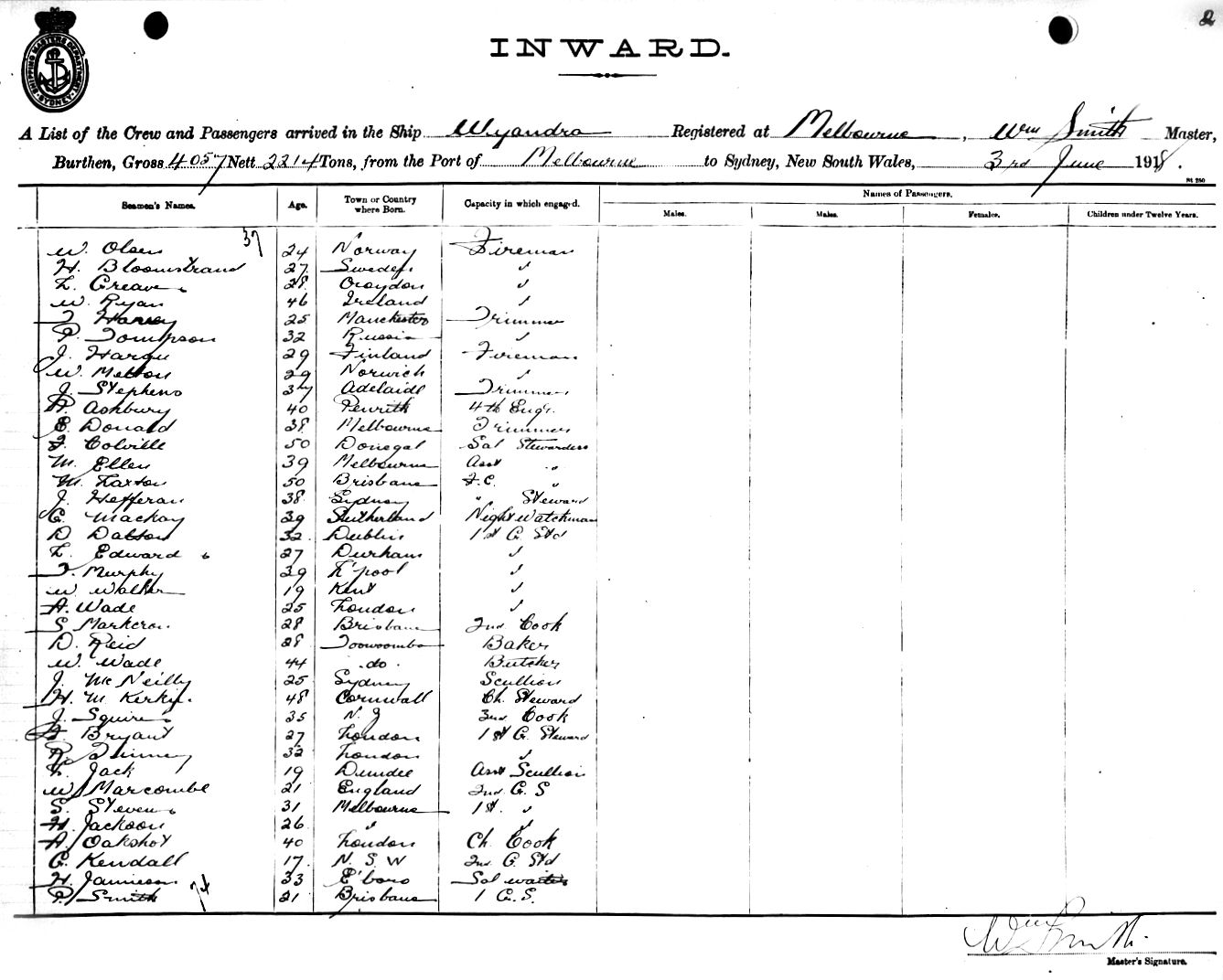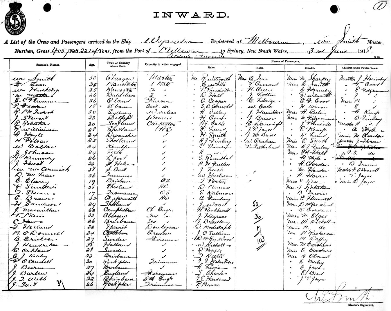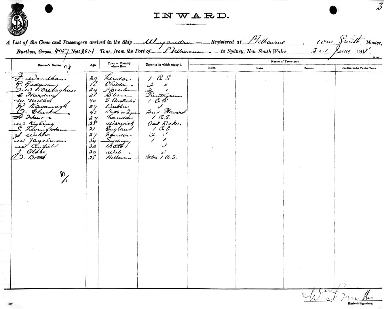 WYANDRAOF MELBOURNE, WM. SMITH, MASTER, BURTHEN 4057/2214 TONS FROM THE PORTS OF MELBOURNE, ADELAIDE & FREMANTLE TO SYDNEY, NEW SOUTH WALES, 3RD JUNE 1918 |