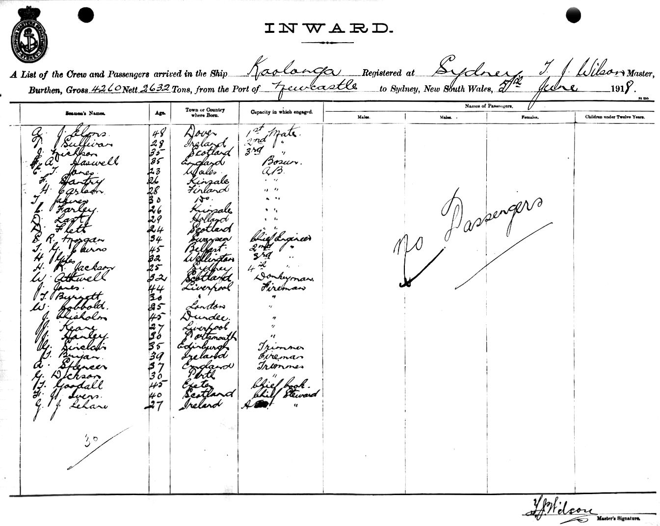 KOOLONGAOF SYDNEY, T.J. WILSON, MASTER, BURTHEN 4260/2632 TONS FROM THE PORT OF NEWCASTLE TO SYDNEY, NEW SOUTH WALES, 5TH JUNE 1918 |